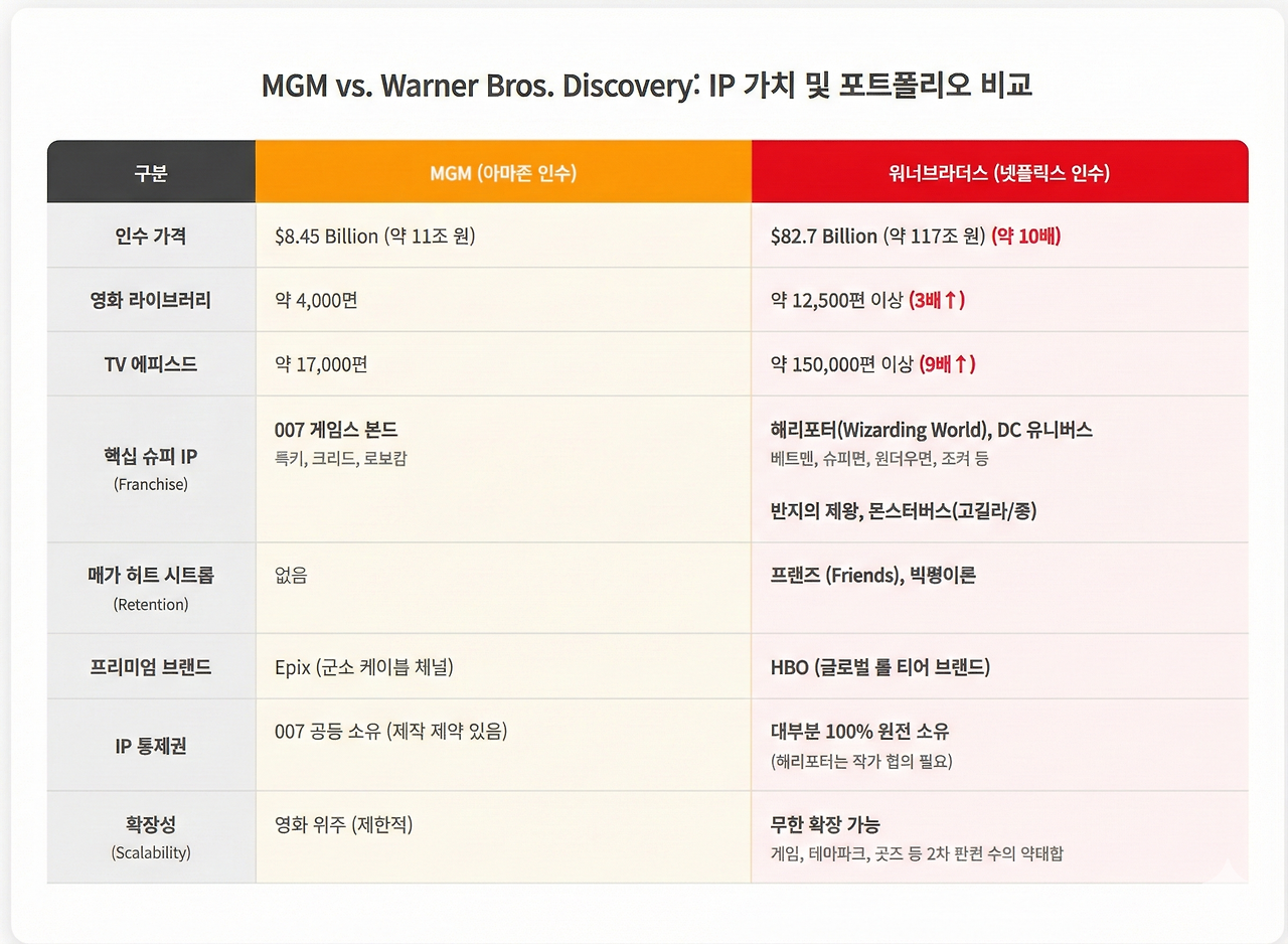 다음으로 아마존의 MGM 인수 건 (85억 달러)을 살펴보자. 이 건은 빅테크가 전통 할리우드 스튜디오를 인수했다는 상징성을 가지고 있다. 무엇보다 이 딜은 IP의 가치면에서 WBD를 평가할 수 있는 중요한 기준(baseline)이 될 수 있다. MGM이 가진 IP의 질과 양을 분석하고 이를 워너와 비교해 보면, 왜 두 회사의 인수 대가가 10배나 차이 나는지, 그리고 넷플릭스의 배팅이 과연 합리적인지 판단할 수 있다.