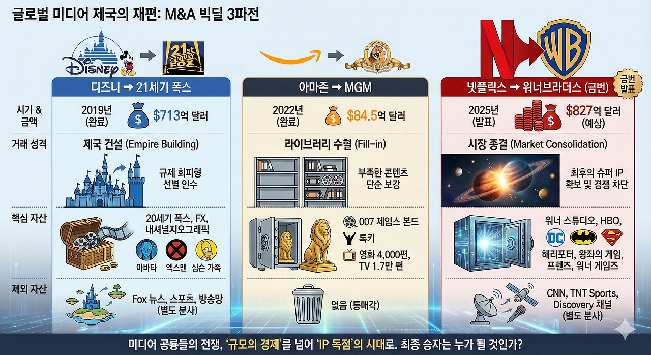 2019년 완료된 월트 디즈니 컴퍼니의 21세기 폭스 인수는 미디어 산업 역사상 가장 거대하고 복잡한 프로젝트의 하나였지만 구조 자체는 넷플릭스의 이번 딜과 매우 유사하다. 선별적인 인수 구조였고, 그 최종 목적지 또한 '스트리밍 패권의 완성'이라는 점에서 일치한다. 그래서 디즈니가 6년 전 보여준 행보는 이번 딜의 선행 지표에 가깝다.