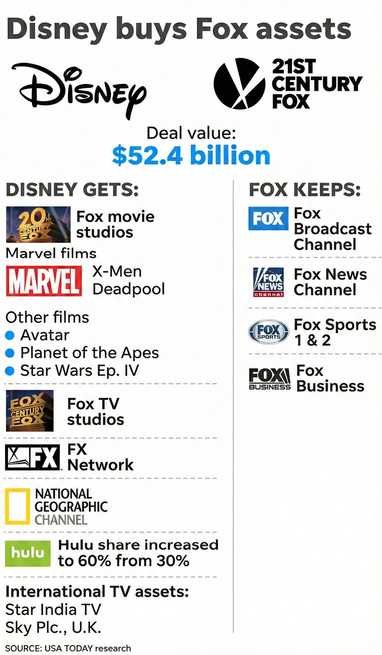 결과적으로 21세기 폭스의 자산은 디즈니의 약점들을 완벽하게 보완해 주었다. 흩어졌던 마블 유니버스를 완성했다. 디즈니는 마블을 소유하고 있었지만, <엑스맨>, <데드풀>, <판타스틱 4>의 판권은 폭스 소유였다. 폭스 인수를 통해 남의 집살이를 하던 자식들을 모두 마블 시네마틱 유니버스(MCU)로 복귀시킴으로써, 디즈니는 향후 10년 이상의 확실한 먹거리를 확보하게 되었다.