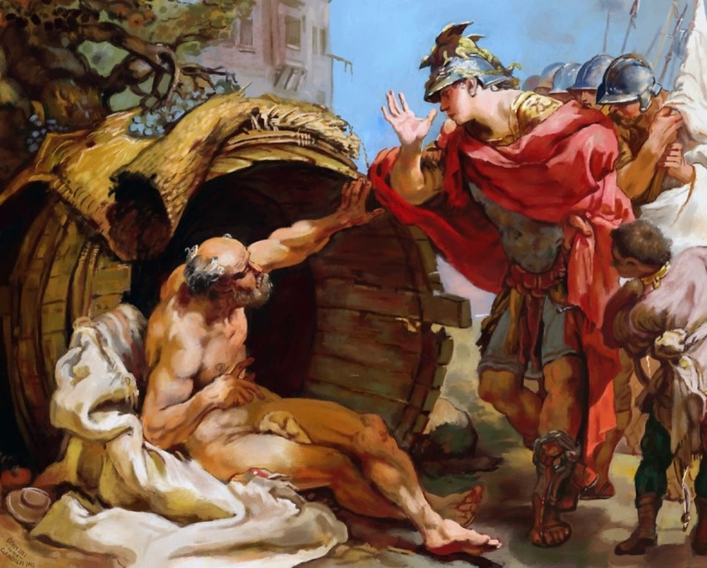 기원전 334년 그리스의 여러 폴리스(도시국가)의 대표들이 코린트에서 회합을 갖고 알렉산드로스를 아시아 출정군의 최고사령관으로 선출했다. 이에 명망이 높은 정치가, 유명 예술가와 철학자들이 알렉산드로스를 알현(謁見)하고자 줄을 이었다. 알렉산드로스는 예전부터 꼭 한 번 보고 싶었던 디오게네스를 불렀으나 오지를 않자 몸소 그를 찾아간다.