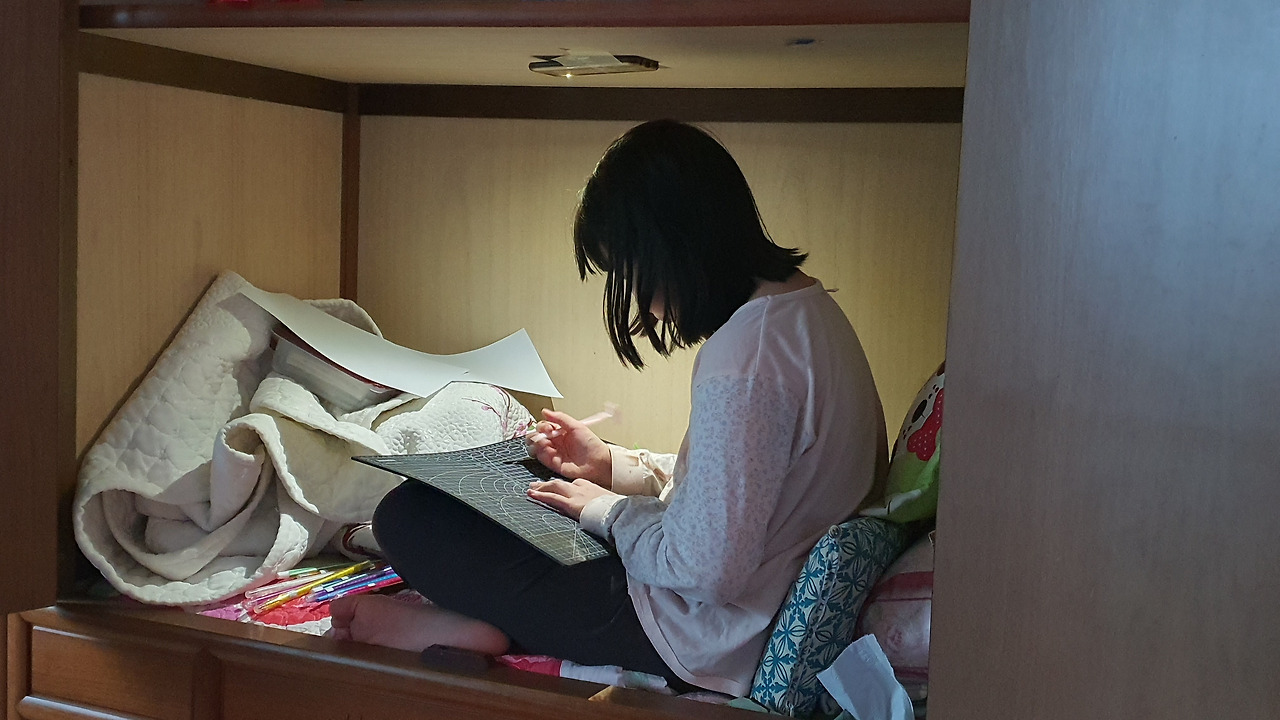 우리 부부는 시댁에 방 한 칸을 빌려 재택근무를 하고 있다. 방학이 되면 아이들까지 끌고 출근한다. 이제 막 가슴이 봉긋해오기 시작한 윤서는 겨울방학이 되자 겨울잠 자리 잡으려는 곰마냥 여기저기 들쑤시고 다녔다. 소파 구석, 책상 아래, 식탁 밑 등에 담요며 가방 같은 것들을 끌고 들어가다 우산까지 펴서 칸막이를 만들기도 했다. 그러다 안착한 곳이 30년쯤 된 시어머니의 장롱이다. 할머니의 장롱에서 이불을 다 끄집어내고 이런저런 물건을 죄다 물어다 놓고 둥지를 틀었다. 형님이 시집올 때 해온 예단이었던 베개는 등받이가 되어있다. 큰 시누가 시집가며 해준 누비이불도 한쪽으로 대충 구겨져 있다. 첫째가 아기 때 쓰던 낮은 베개와 시댁 와서 자고 갈 때 셋째가 쓰는 베개도 그저 둥지 짓는 재료다. 장롱 안이 어둡다며 땡글땡글 눈알을 한참 굴리더니 급할 때 연락하라고 사준 휴대폰을 천장에 떡하니 거꾸로 붙여놓고 조명으로 쓴다. 그러고는 무척 마음에 든다는 듯이 제 살림을 잔뜩 끌고 할머니의 장롱 안으로 기어 들어간다. 언젠가 열이 올라 아픈 식구에게 사다 줬던 죽통에 색연필, 스티커 같은 것을 잔뜩 넣고 보물함 대하듯이 하는데, 누비이불 제일 위에 자리 잡았다. 책상에 칼자국 내지 말라고 사준 고무매트는 간이 책상이 되었다. 사촌 언니가 쓰다 싫증 나서 치워둔 샤프를 들고 종이를 한 장 펼친다. 한참 끄적이다 뭔가 잘 풀리지 않으면 손 안의 필기구를 살살 돌린다. 그럼 곧 좋은 생각이 떠오른 듯 잔뜩 웅크리고 무언가 열심히 적기도, 그리기도 한다.