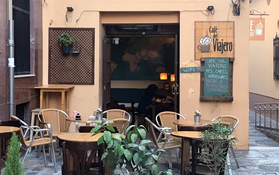 말라가의 핵 관광지인 알카사바 요새를 지나가다가 우연히 고개를 왼쪽으로 휙 돌린 순간 카페 하나가 눈에 들어왔다. 작은 테라스 사이로 난 문으로 세계 지도가 보였다. 이름도 여행자 카페래. 들어가 보지도 않고서 왠지 끌려 구글지도에 표시해 놨더랬다,