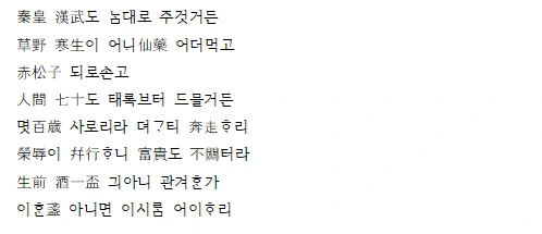진시황제의 불로장생이라는 꿈은 참으로 허망했다. 먹으면 죽지 않는 불사약(不死藥)을 찾아오라고 그 많은 사람들을 나라 밖으로까지 내몰았지만 진시황도 결국 남들처럼 죽음을 피할 수는 없었다. 한나라의 전성기를 영위한 황제 무제(武帝) 역시 남들처럼 죽어갔다. 전설로만 존재하는 적송자(赤松子)처럼 신선이 아닌 인간이라면 누구나 그렇다는 말이다. 게다가 영예와 치욕은 늘 붙어 다니고 부귀도 자신과는 상관없다면서 삶을 살아가는 것이 뜻대로 되지 않더라고 토로한다. 삶은 뜻대로 되지 않으면서도 근심과 걱정은 살수록 더해가니 술 한잔으로 잊자는 것이다. 사백 년 전이나 지금이나 우리 삶의 무게는 마찬가지인 것 같다.