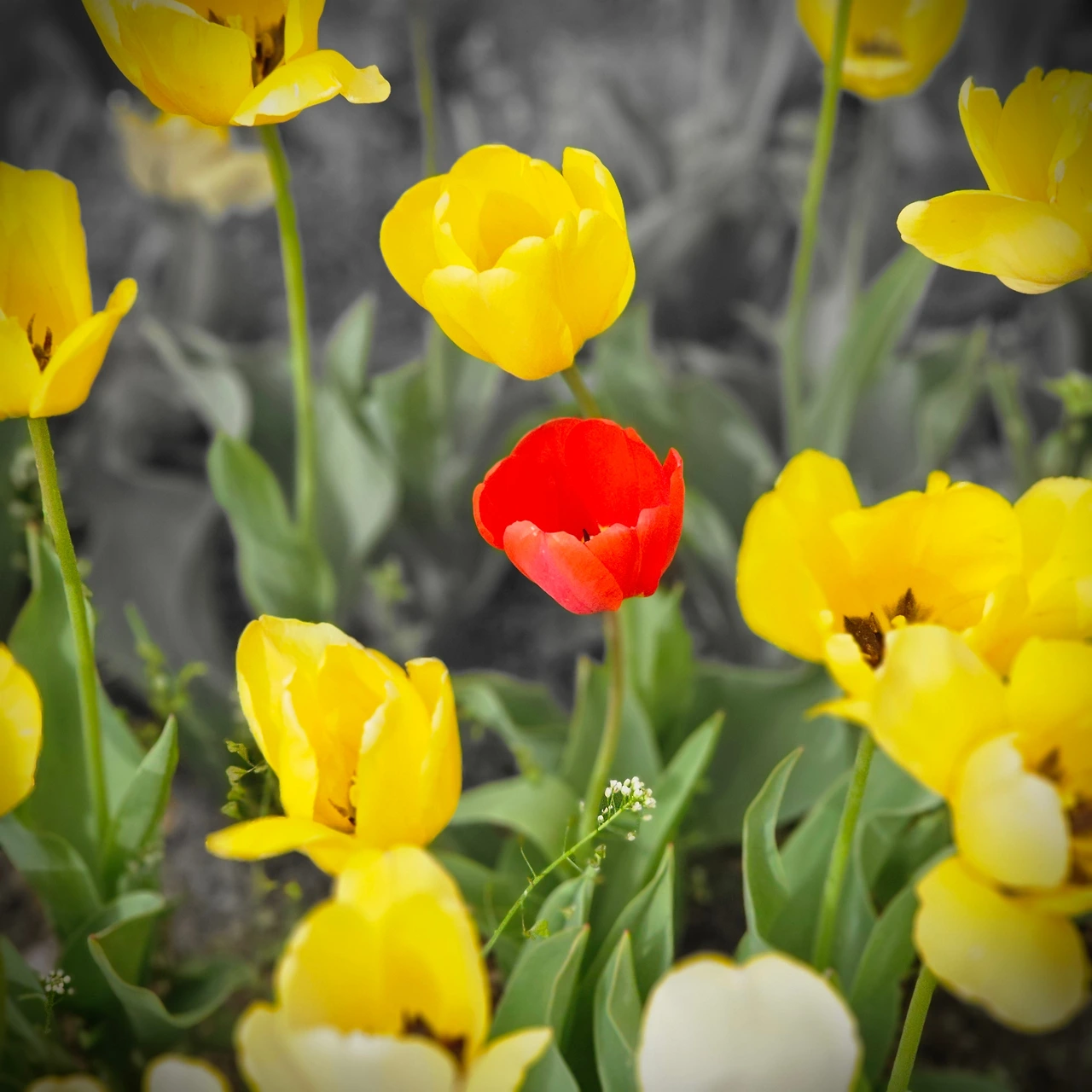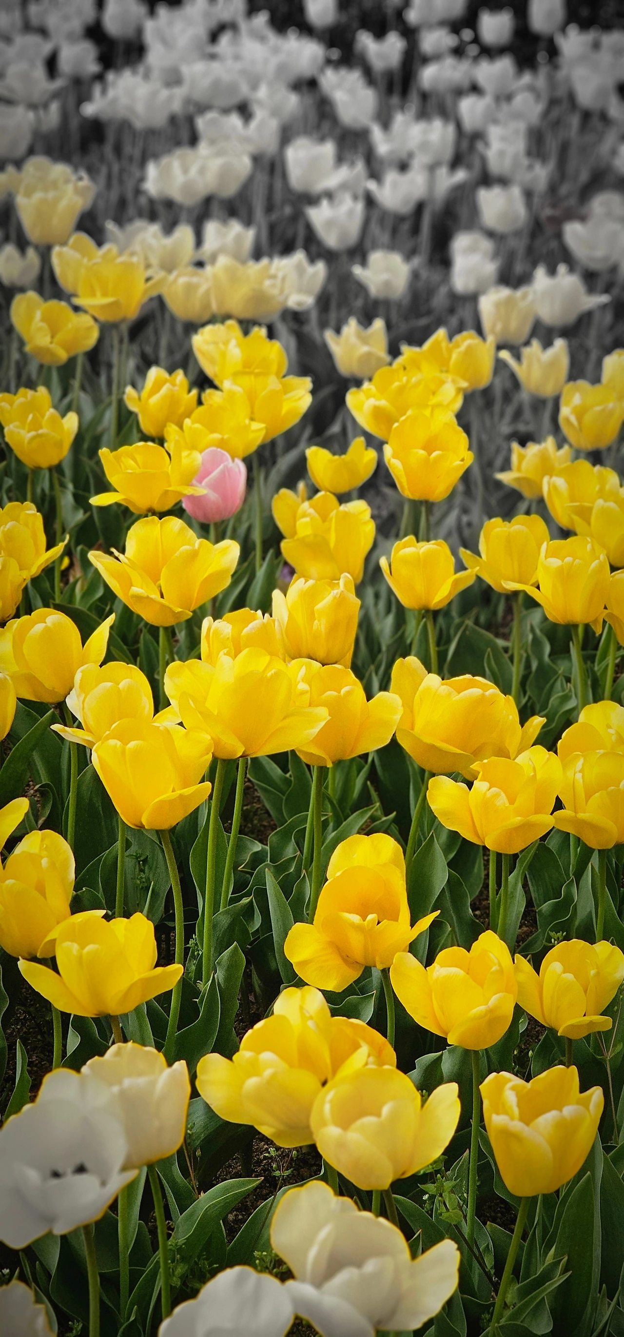 무채색 배경을 뚫은 샛노란 튤립들