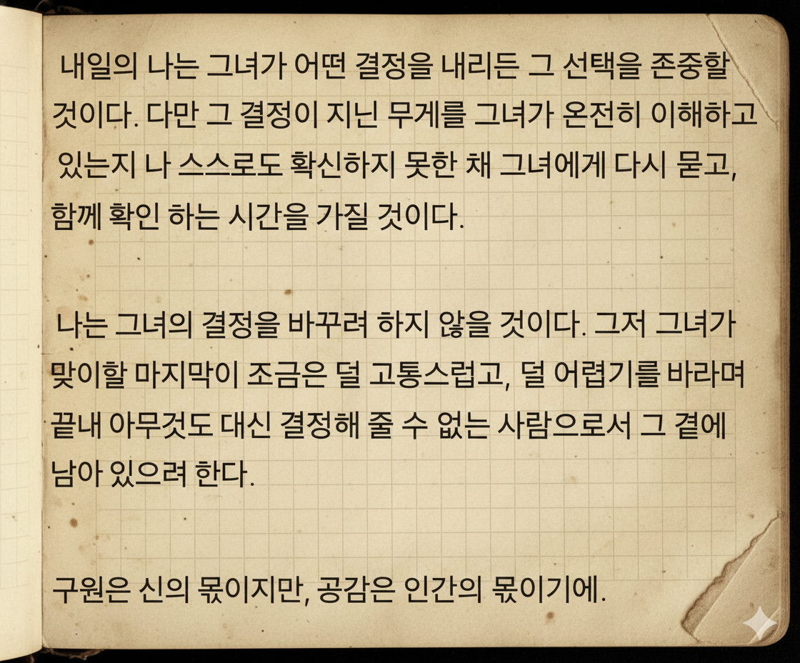 37세 말기 위암으로 인한 장폐색 환자를 보기 전,어제 내가 쓴 글에는 마치 주문 같은 다짐이 들어 있었다. 나는 오늘 그녀와 삼십 분 남짓 이야기를 나눴고, 그 끝에 거의 탈진한 듯한 기분이 되었다.의자에 앉아 숨을 돌렸다. 내 몸에는 더 이상 병동을 돌 만큼의 에너지가 남아 있지 않은 듯했다.