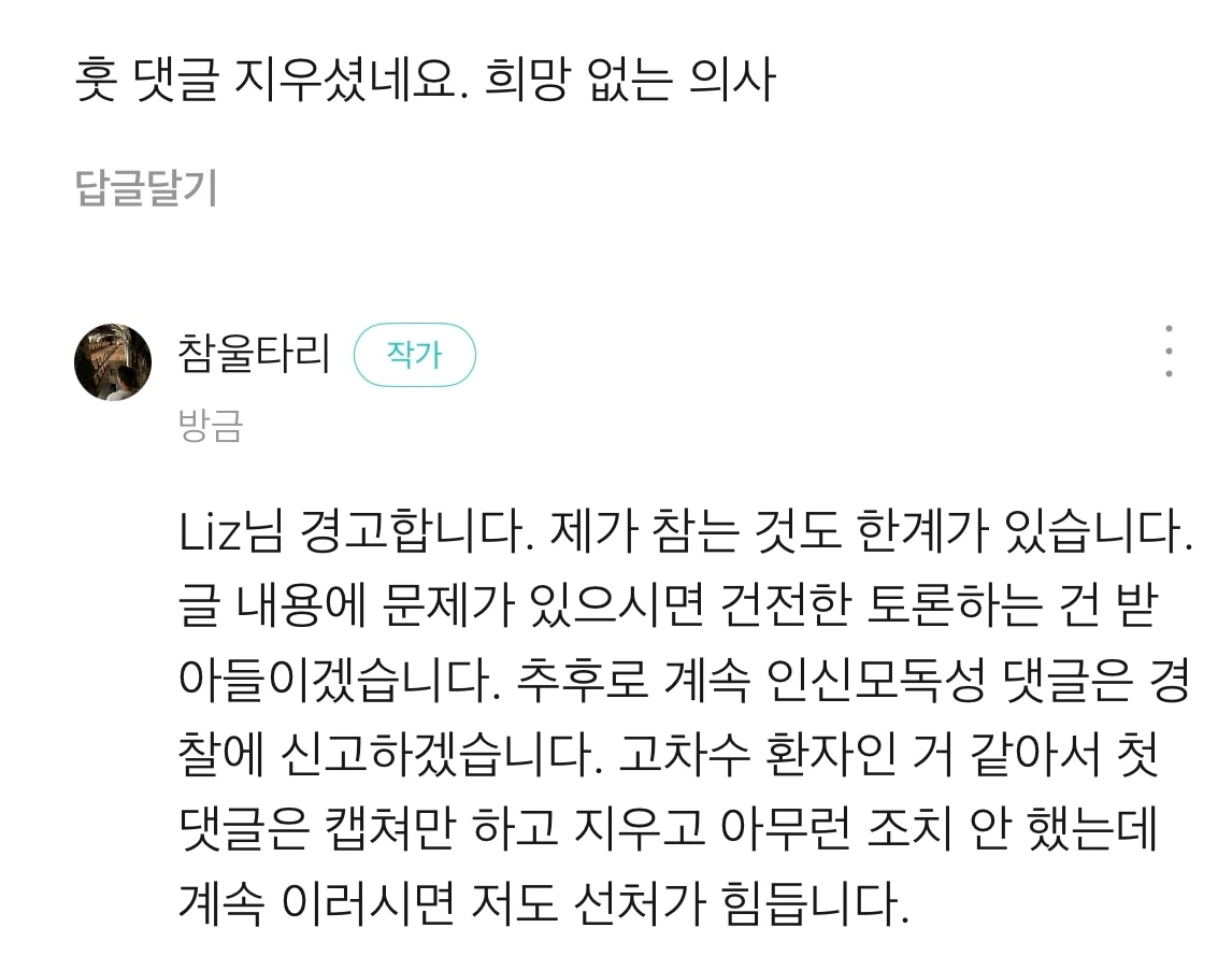 “글의 내용에 대한 토론은 언제든 환영합니다. 하지만 인격을 겨냥한 모욕에는 더 이상 대응하지 않겠습니다. 필요하다면 신고하겠습니다. 처음 댓글을 지운 건, 당신을 이해하려 했던 선처였습니다.”