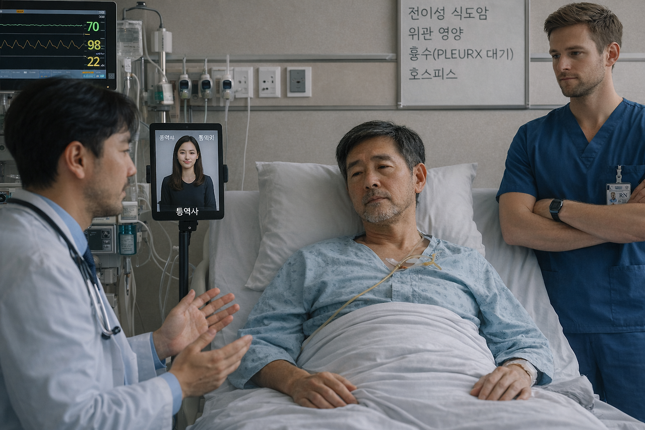 나는 간호사에게, 회진 전에 틀어놓은 통역 서비스를 잠시 중단해도 되는지 조심스레 물었다. 방 안의 공기는 한층 팽팽해졌다. 간호사는 팔짱을 끼고 내 시선을 피하며, 마치 자신도 이 대화의 중심이 되어야 한다고 주장하듯 거부했다.