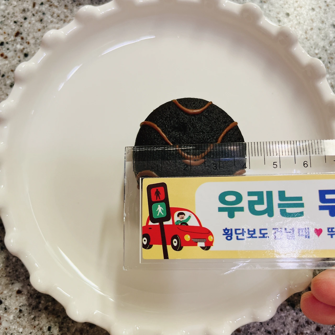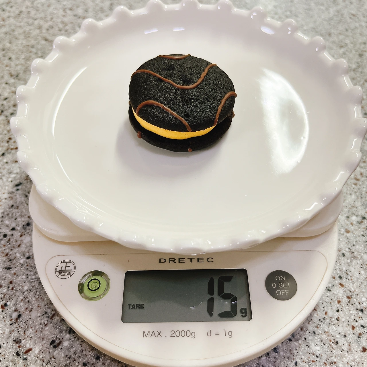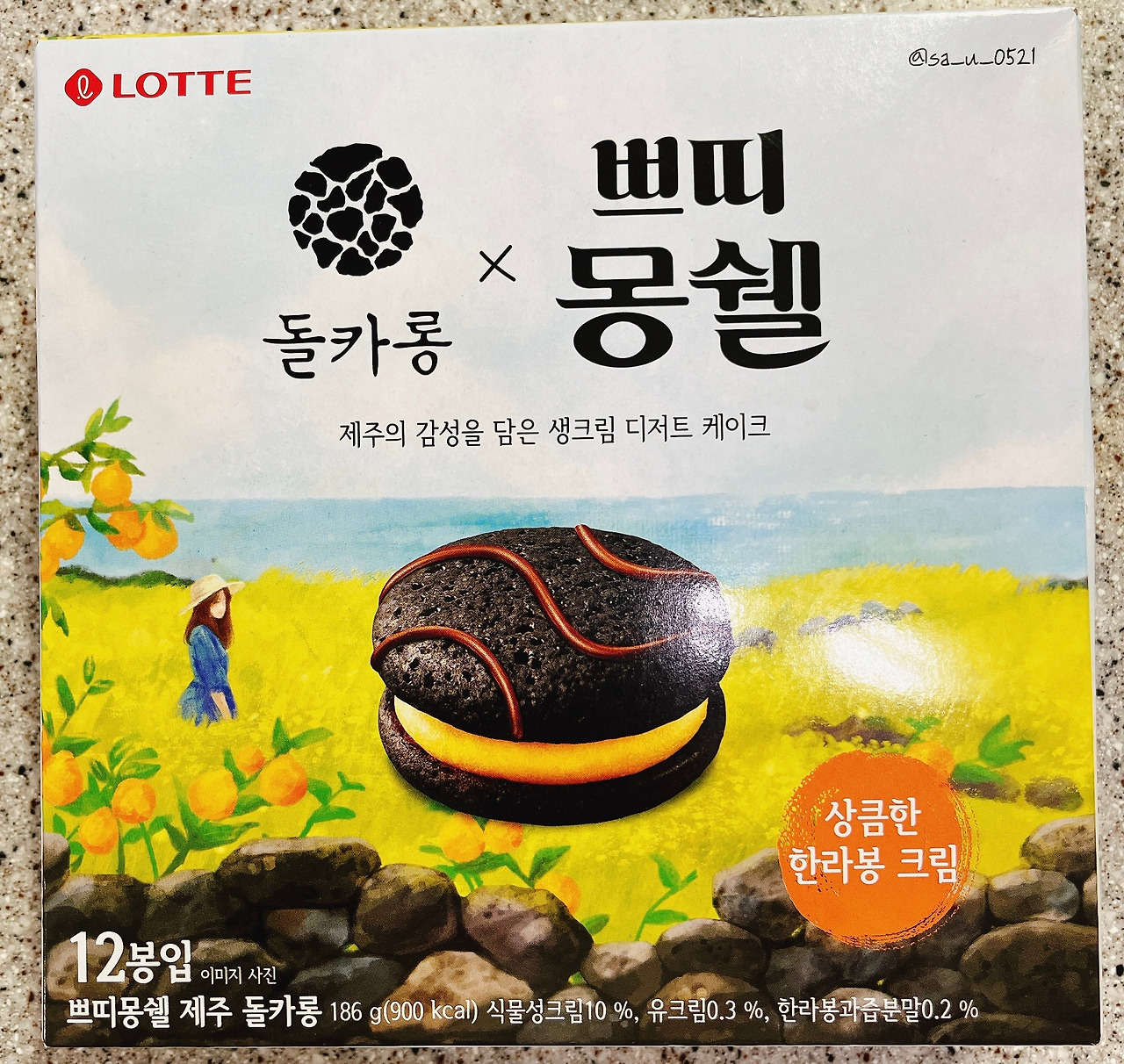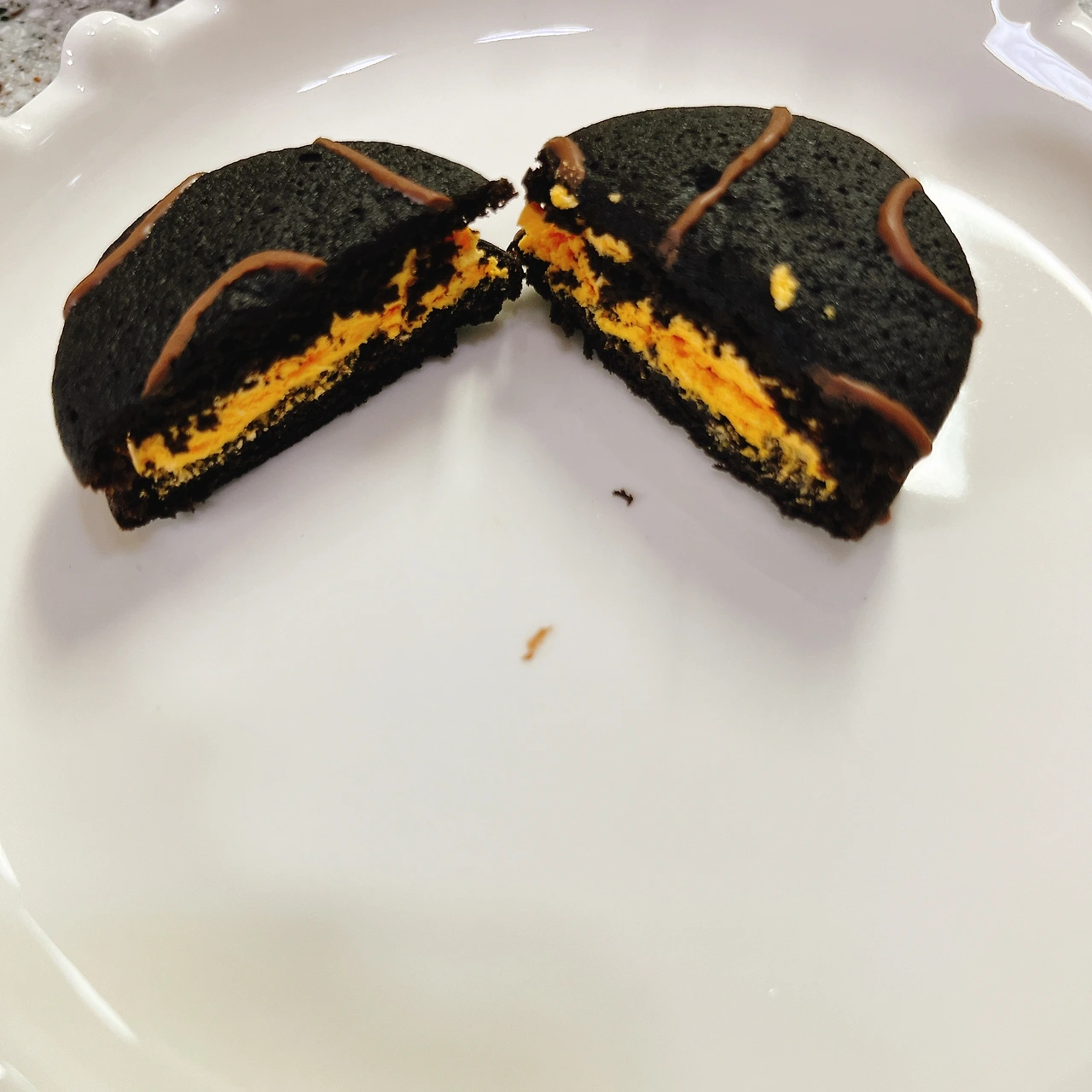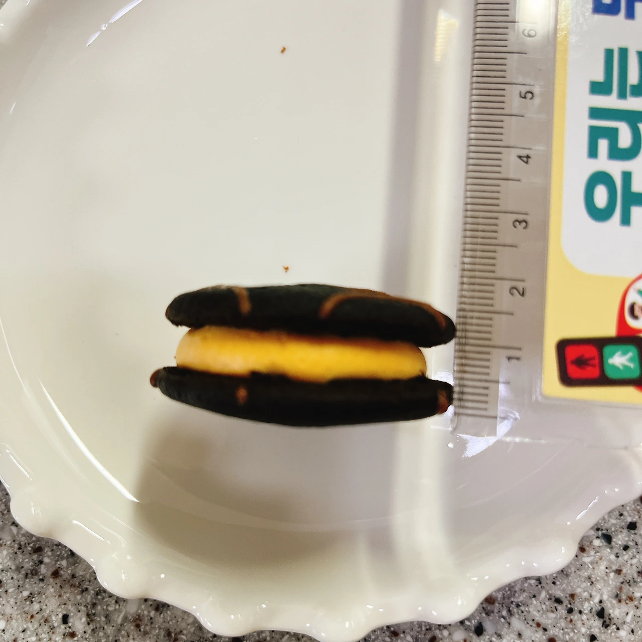 4. 모양: 샌드과자처럼 몽쉘 특유의 갈색 무늬가 그려진 검은색 빵이 위아래 있고, 가운데에는 주황색 크림이 발라져 있다.