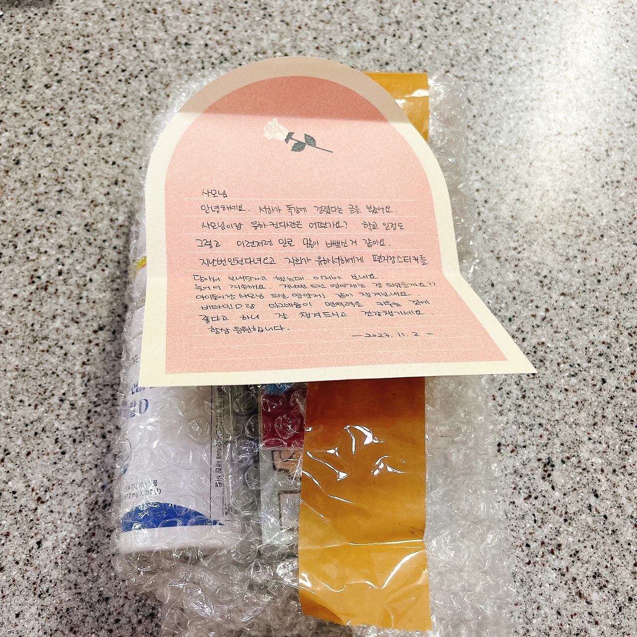 편지를 살펴본다. 페이스북에서 까꿍이가 독감에 걸렸다는 소식을 보시고선 영양제를 보내주셨다. 세상에. 그 멀리서 또 이렇게 우리를 챙겨주시다니. 이 마음을 무엇으로 보답해야 하려나.