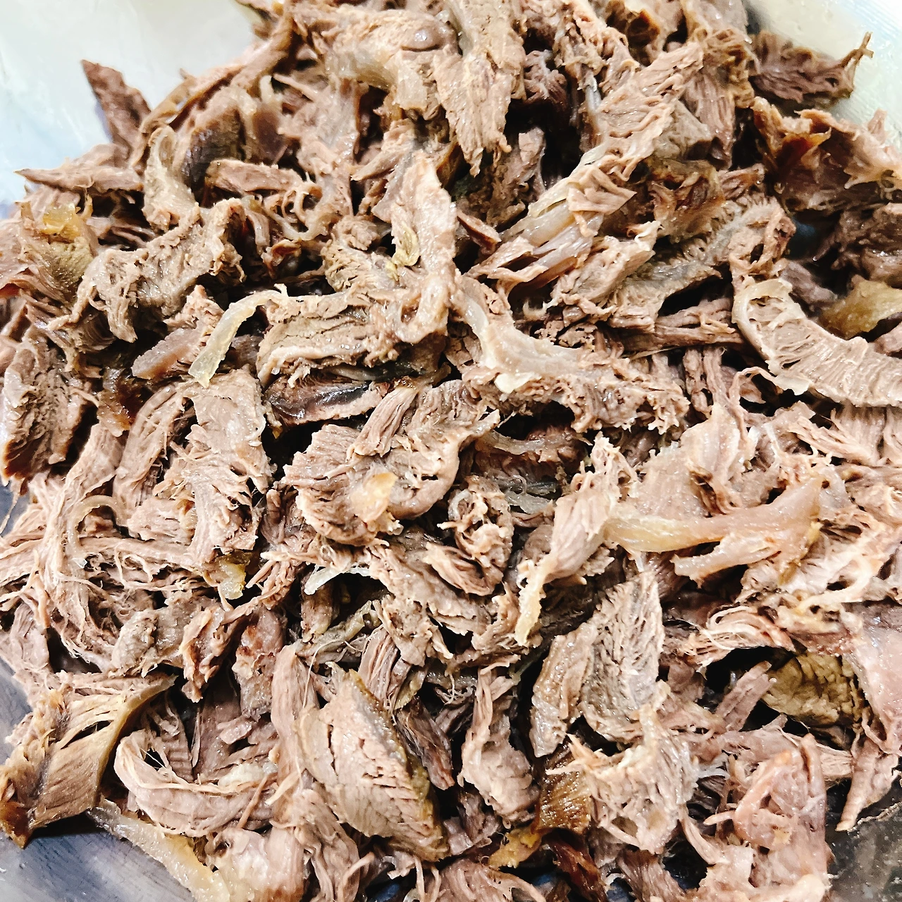 그 사이, 우리 가족은 저녁을 먹는다. 물이 졸아들고 덩어리 고기가 익었으면 고기를 건져서 식힌다. 대파, 양파, 깐 마늘, 통후추도 건져낸다. 깔끔하게 걸러지지 않아 체에 거른다. 그 사이 저녁 먹은 걸 치우고 식힌 고기를 잘게 찢는다. 알사태라 그런가, 힘줄이 꽤 보인다. 수육용이라서 그런지, 쫄깃하면서도 투명한 부분도 군데군데 보이고.