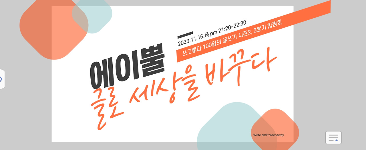 벌써 100일의 글쓰기가 4분의 3을 향해 달려가고 있다. 우리 에이뿔조는 어제 합평으로 만났다. 개인 사정으로 불참한 혜똥 님과 엠피타자기 님을 제외하고, 나, 삼다용님, 펄케이 님이 이렇게 셋이 함께 모였다.