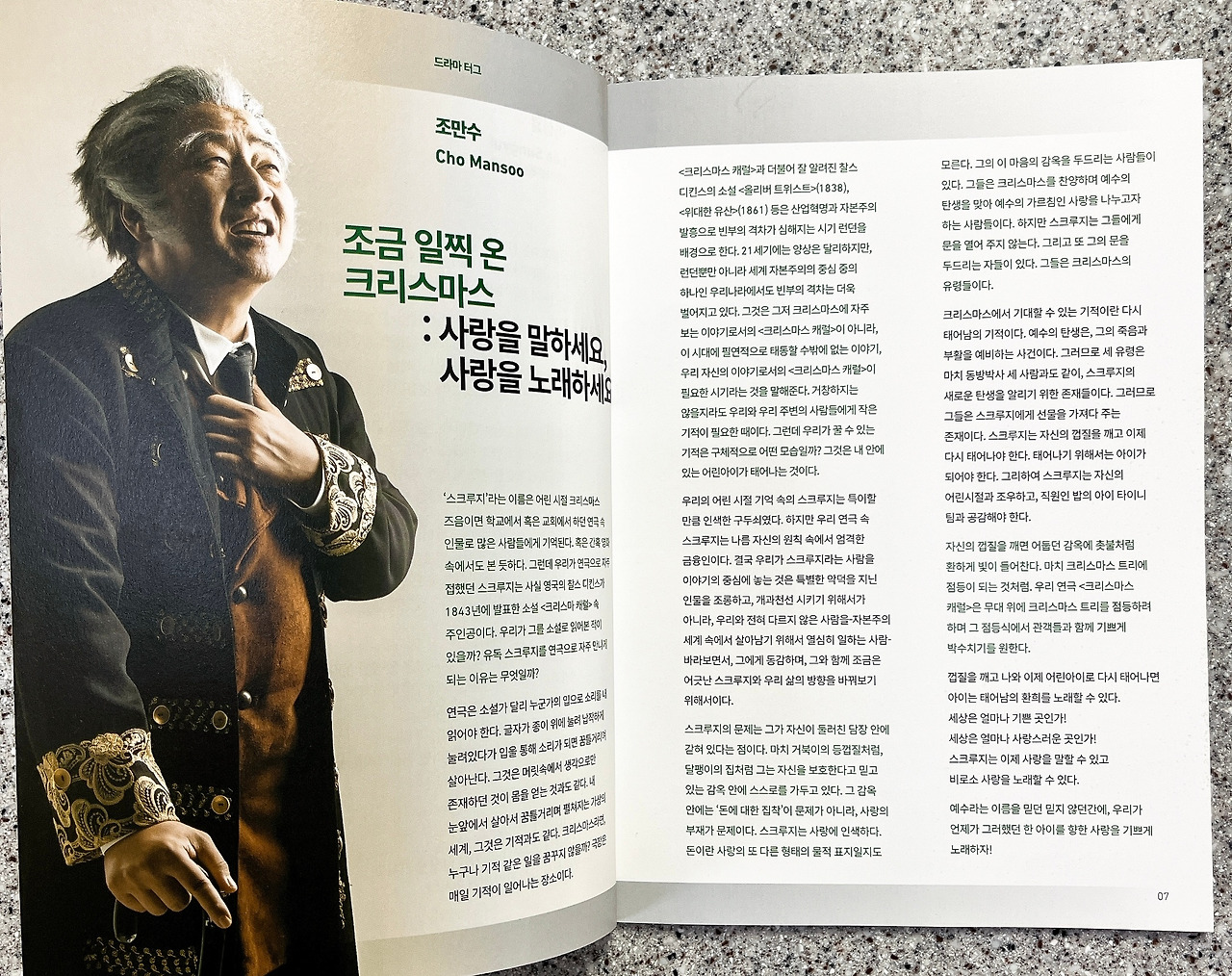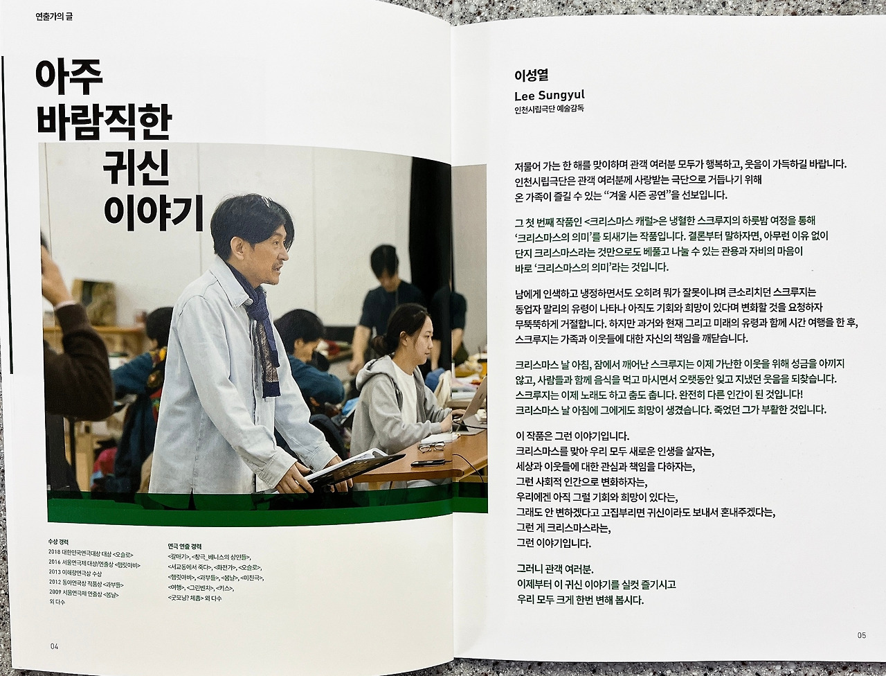 프로그램 북에서 스크루지 역을 맡은 배우의 인터뷰가 인상 깊었다. 그는 스크루지가 절대적 악인이 아니라, 우리와 다르지 않은 사람이라 말한다. 자본주의 세계 속에서 살아남기 위해 열심히 일하는 사람, 다만 사랑에 인색한 사람이자 삶의 방향이 조금 어긋난 사람이라고 말이다.