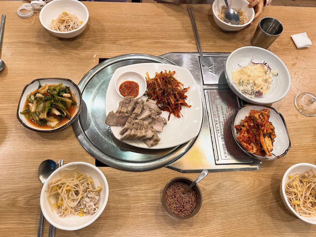 정식은 1만 원인데 보쌈과 콩나물밥, 그리고 칼국수나 떡만둣국이 나온다. 먼저 보리밥에 콩나물 넣은 것을 주신다. 3개를 시켰는데 밥은 4개를 주셨다. 감사하다.