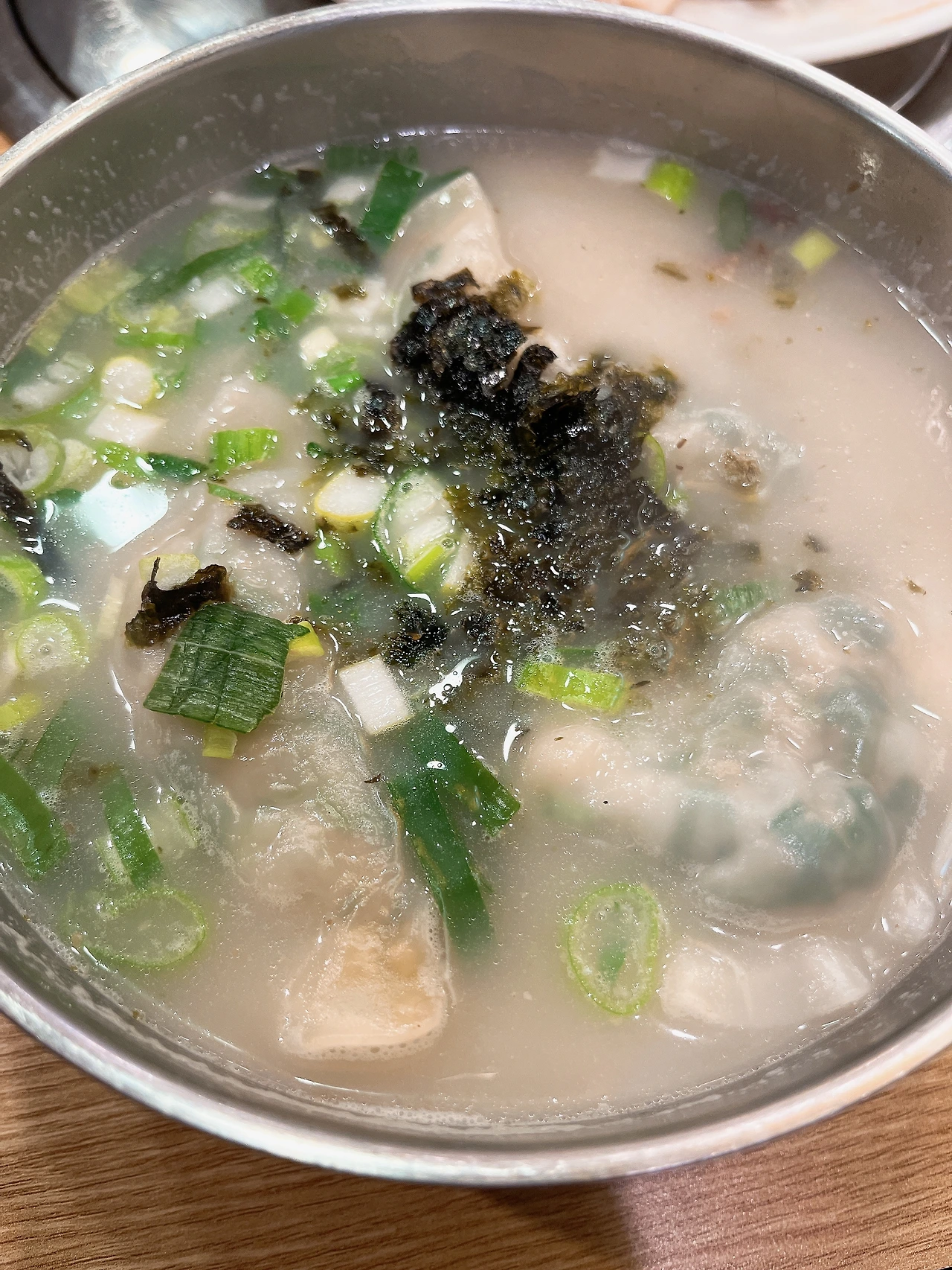 나와 나물이는 떡만둣국인데 나물이도 표정이 별로다. 나물이는 김 가루가 들어간 떡만둣국을 좋아하지 않아서 그렇다. 어쨌든 그럼에도 떡을 열심히 골라 먹는다. 만두는 고기만두만 들어있는데 3개가 들어 있다.