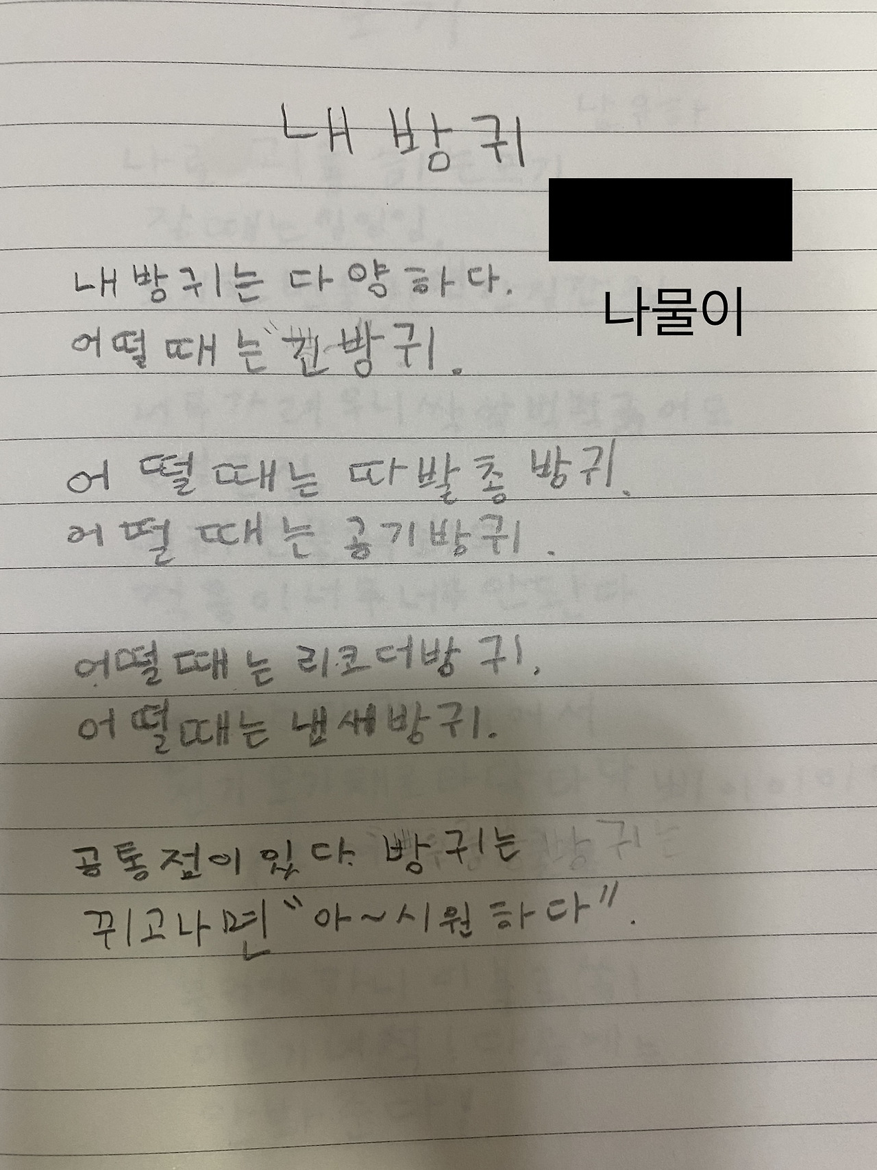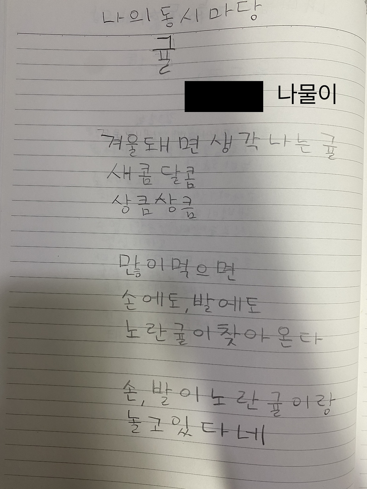 아이들 앞에서 글을 많이 쓰진 못했는데, 더구나 내가 쓰는 글은 대부분 산문인데 시라니. 이번에도 참 어여쁜 콩이 나왔다. 학부 시절에도 시에는 영 흥미를 느끼지 못해, 전공 필수가 아니면 시 관련된 수업은 듣지 않았는데, 시 쓰는 나물이라니, 시 쓰는 딸이라니 신통하다.