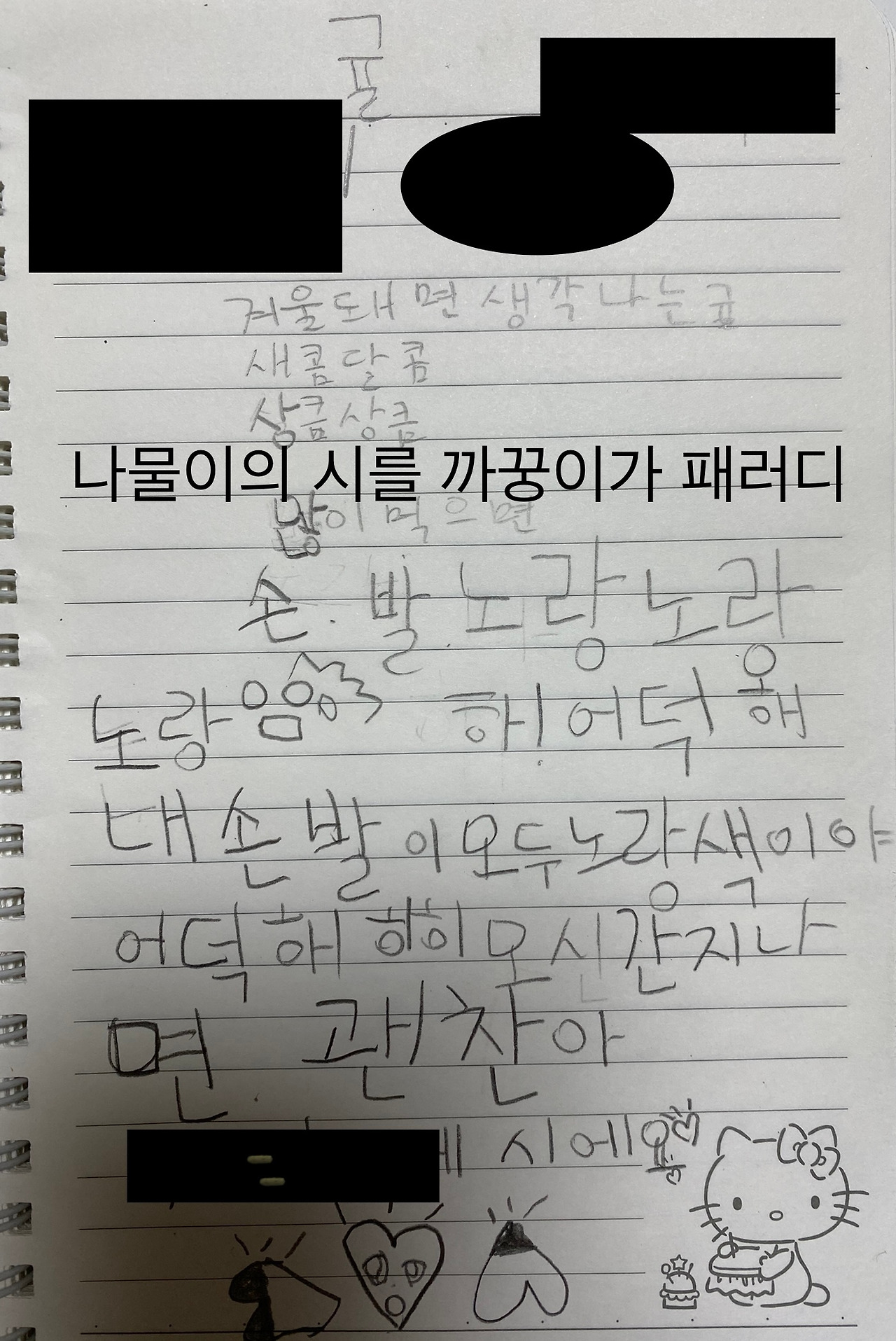 언니의 시를 보더니, 까꿍이도 언니의 시를 패러디해서 자기만의 시를 써 본다. 아직 겹받침이 어려운 까꿍이의 시는 어딘지 모르게 웃음이 나면서도 까꿍이만의 매력이 묻어난다. 같은 듯 다른 두 아이의 시를 읽고 있으니 참 감사해진다.