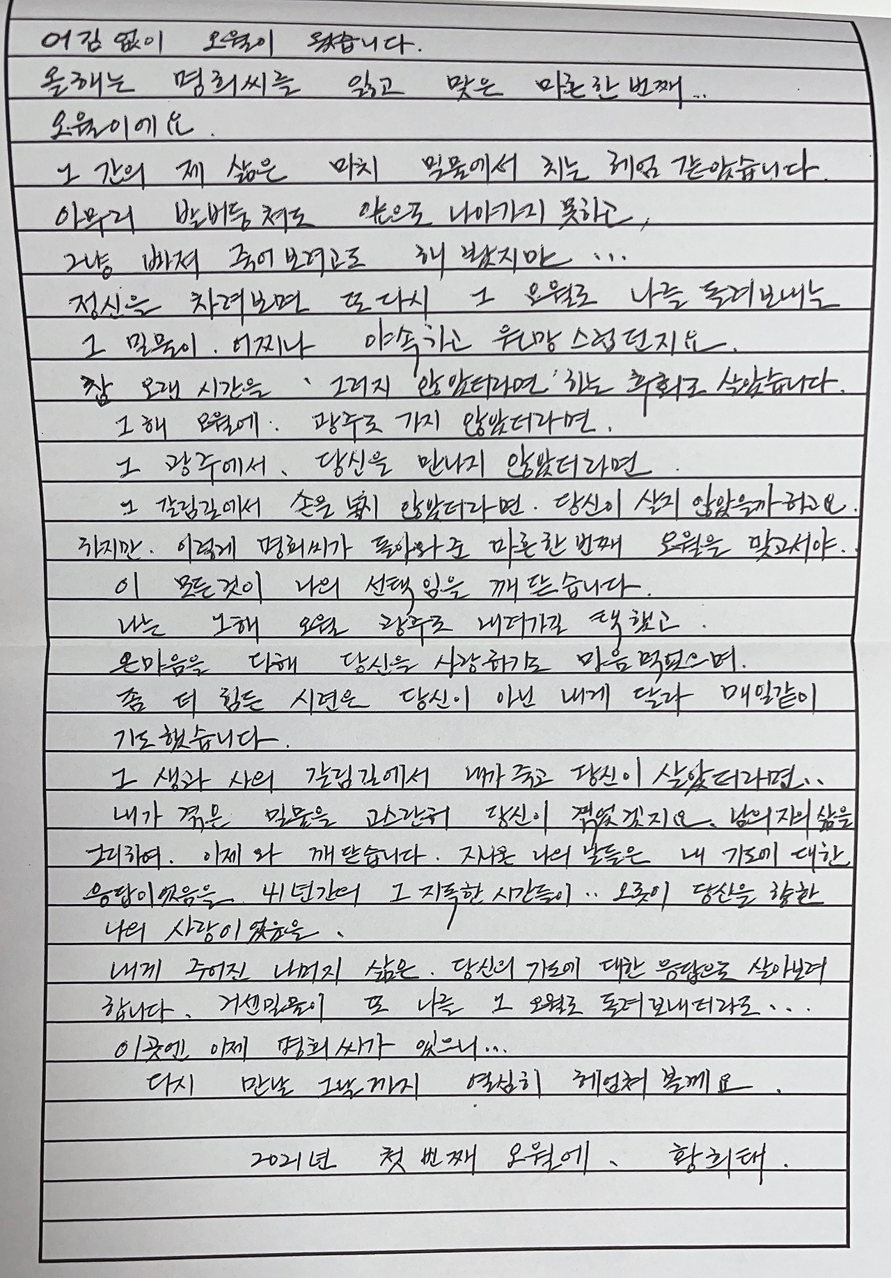 그 오월에서 살아남은 이들은 각자의 보통 날을 살아가고 있었다. 아니, 이미 심상한 오월을 지난 그들이었기에, 보통을 향해 가는 지독한 몸부림을 하였는지도 모르겠다. 그들 앞에 41년 동안 찾아 헤맨 명희의 유골과 유품이 인계되었다. 결국 41년의 기다림 끝에 희태가 명희의 유품을 받아 든 그날도 오월이었고, 명희를 기다린 지 사십 한 번째 오월이었다. 그때 희태가 써 내려간 편지 속에, 지난한 41년간의 지독한 기다림의 시간들이 오롯이 명희를 향한 사랑이었음을 고백하며 드라마는 끝이 난다.
