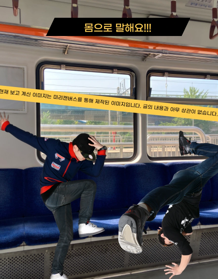사람이 거의 없는 칸에 이르자마자 아이들이 무언가를 하기 시작했다. 일단 핸드폰 두 개를 반대편 의자 위에 올려두었다. 그러더니 다른 편 의자 바로 앞에 서서 춤을 추기 시작했다. 핸드폰이 두 개인 이유는 하나는 음악을 틀고 하나는 동영상을 찍어야 해서였다.