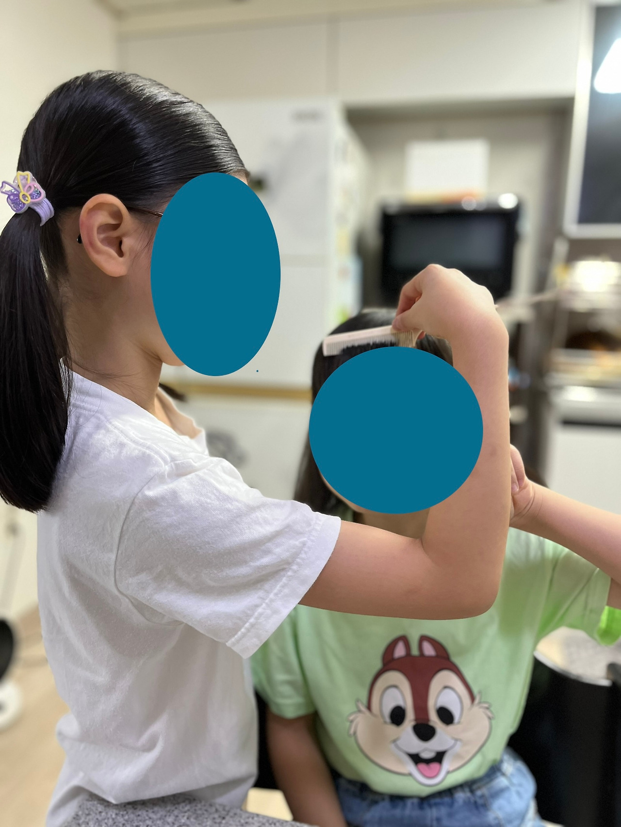 까꿍이의 요청으로 완성된 오늘의 곰머리. 옷도 꽤 신경을 써서 입은 눈치인데, 머리에까지 공을 들일 줄 몰랐다. 게다가 나물이까지 저렇게 동생 머리에 진심일 줄이야. 얇은 꼬챙이 빗으로 섬세하게 머리를 잡아서 총총 땋고는 돌돌 말아 고무줄로 쫑긋 묶어준다. 그리고는 앞머리까지 가지런히 빗어내려 주면 곰머리 완성.