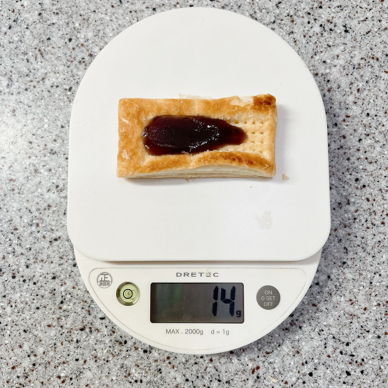 3. 모양: 후렌치파이 모양. 잼 색깔이 다른 제품(딸기, 사과)에 비해 색상이 진한 편임.