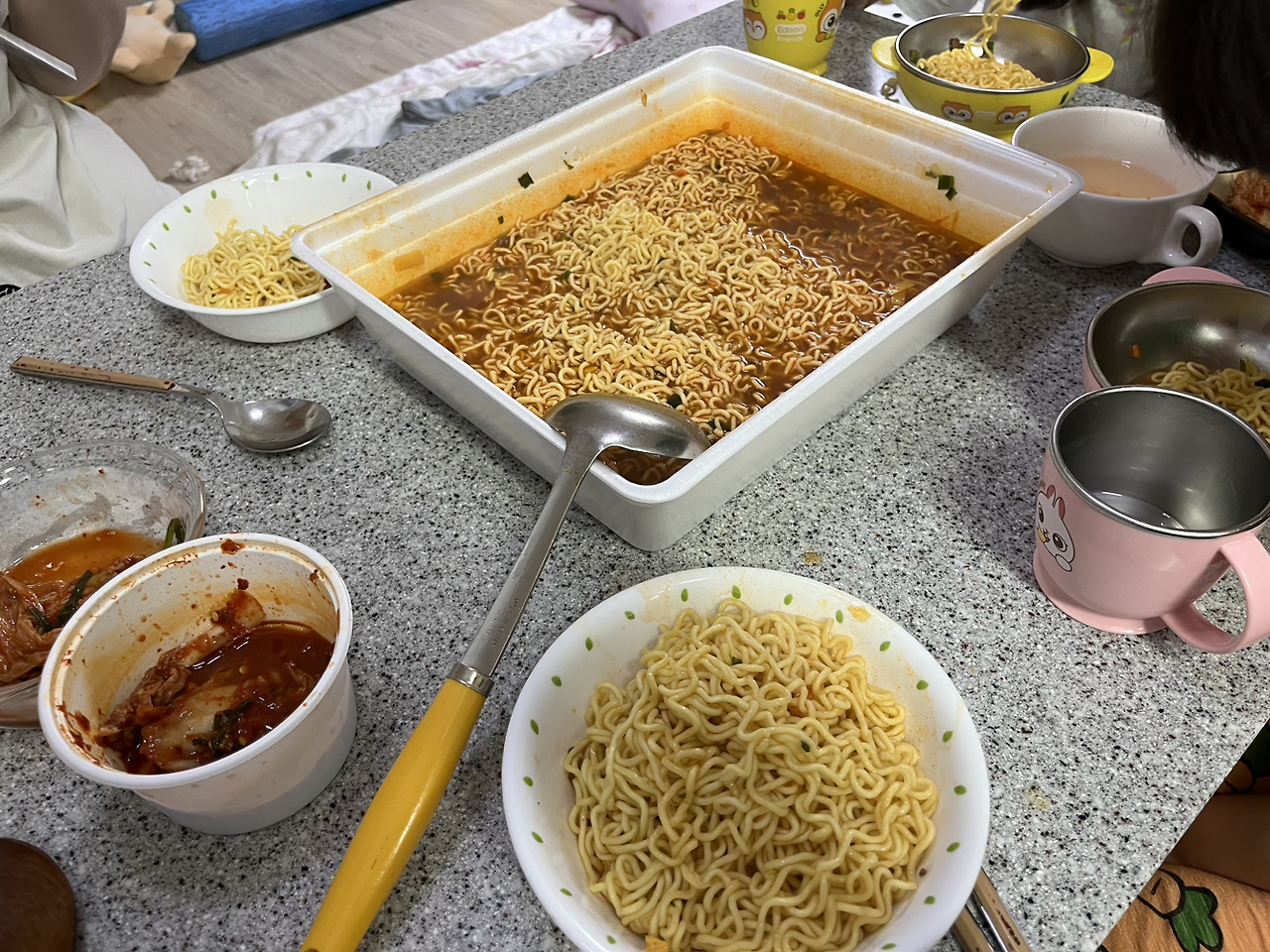 6. 총평: 나또님이 얼마 전, 도전해 보자며 사 왔다. 8인분 정도 되기에 온 가족이 모였을 때를 노렸고, 마침 비도 오고 제법 쌀쌀해진 날씨가 라면과 찰떡이라 먹어 보았다. 일단 양이 정말 엄청났다. 물을 붓기 전까지는 몰랐는데 물을 부어보니 양이 어마어마했다.