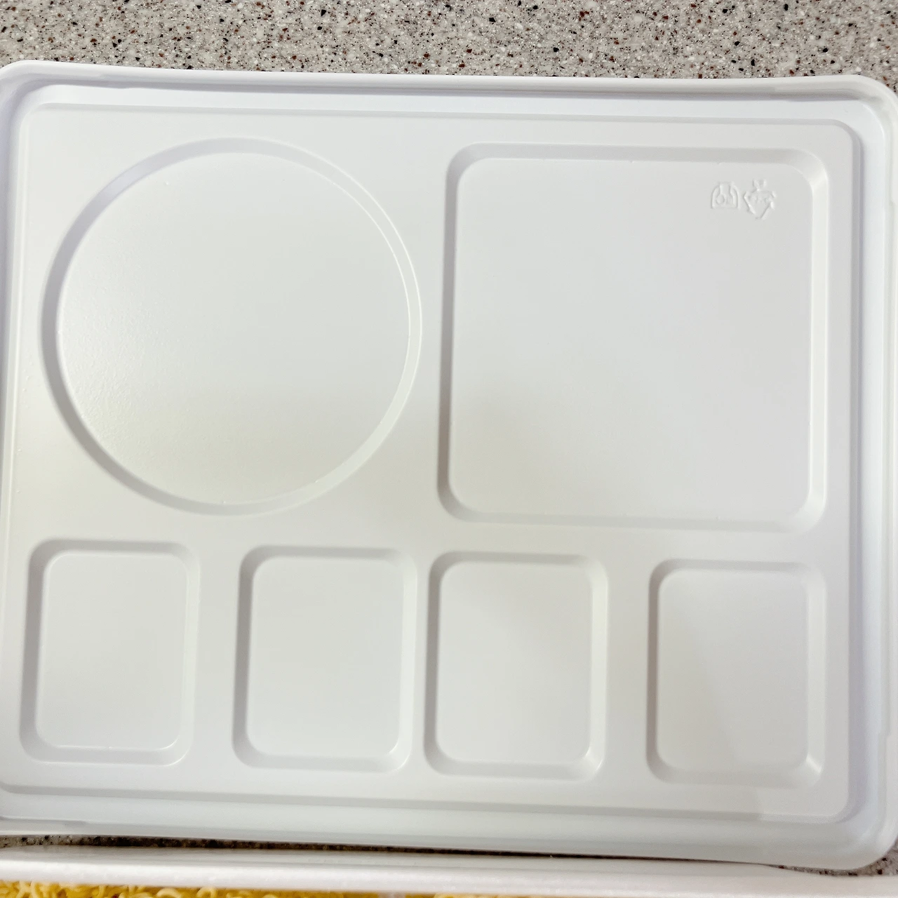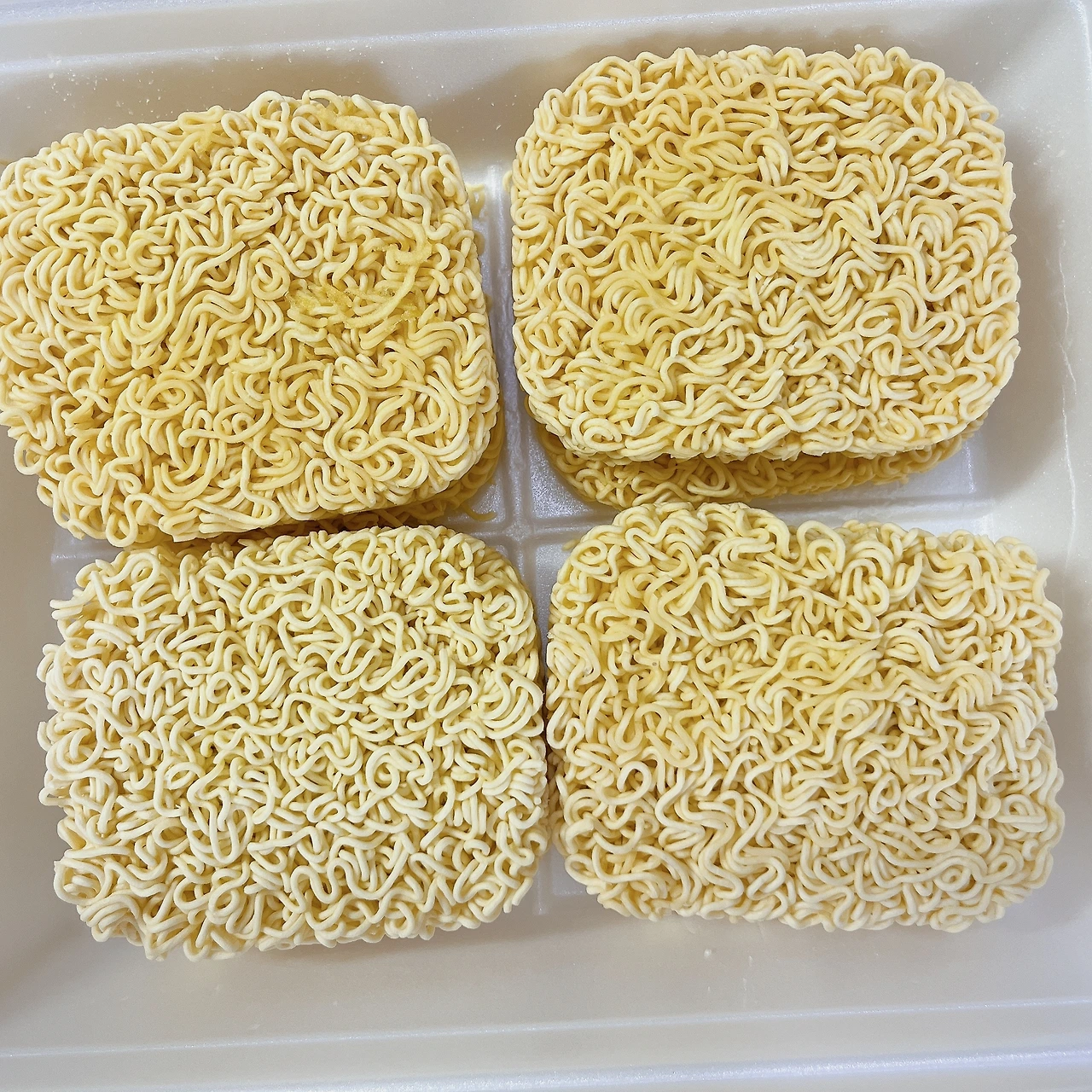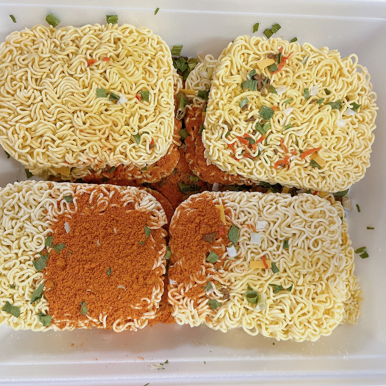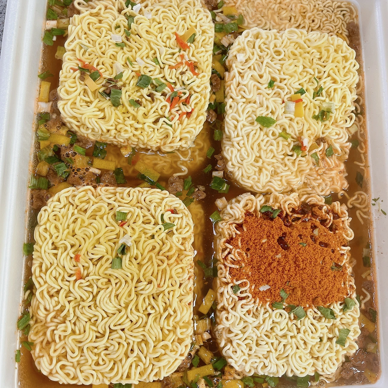 4. 포장: 기존 도시락 라면 포장 용기의 4배 정도 크기였다. 높이는 2배다. 그래서 실제로 라면이 4개씩 위아래 두 줄이 담겨 있었다. 수프도 분말수프와 건더기 수프가 함께 포장되어 있는데, 건더기 수프는 2개로 나누어져 있다. 뚜껑 안쪽이 식판 모양인 것이 특이한 점이다.