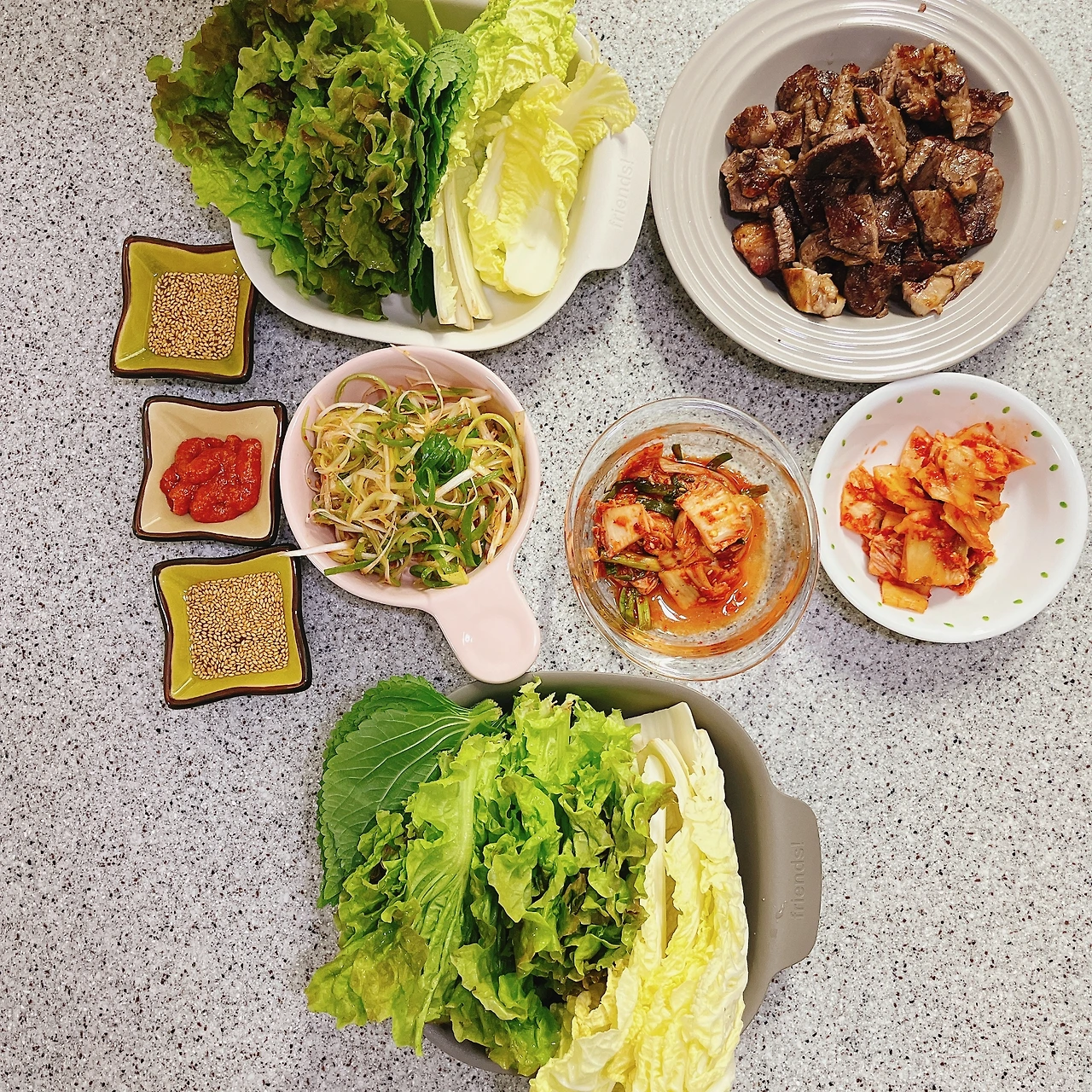 미리 씻어놓은 쌈 채소를 그릇에 담는다. 찬물에 담가 두었다가 물기 빼놓은 파채를 양념에 무친다. 기름장을 만들고, 기름장, 쌈장, 김치를 그릇에 담아둔다. 그들이 도착했다. 서둘러 팬을 달구어 한우를 굽기 시작한다. 치이익-. 고기가 익었다. 잘 익은 고기를 아이들이 먹는다.