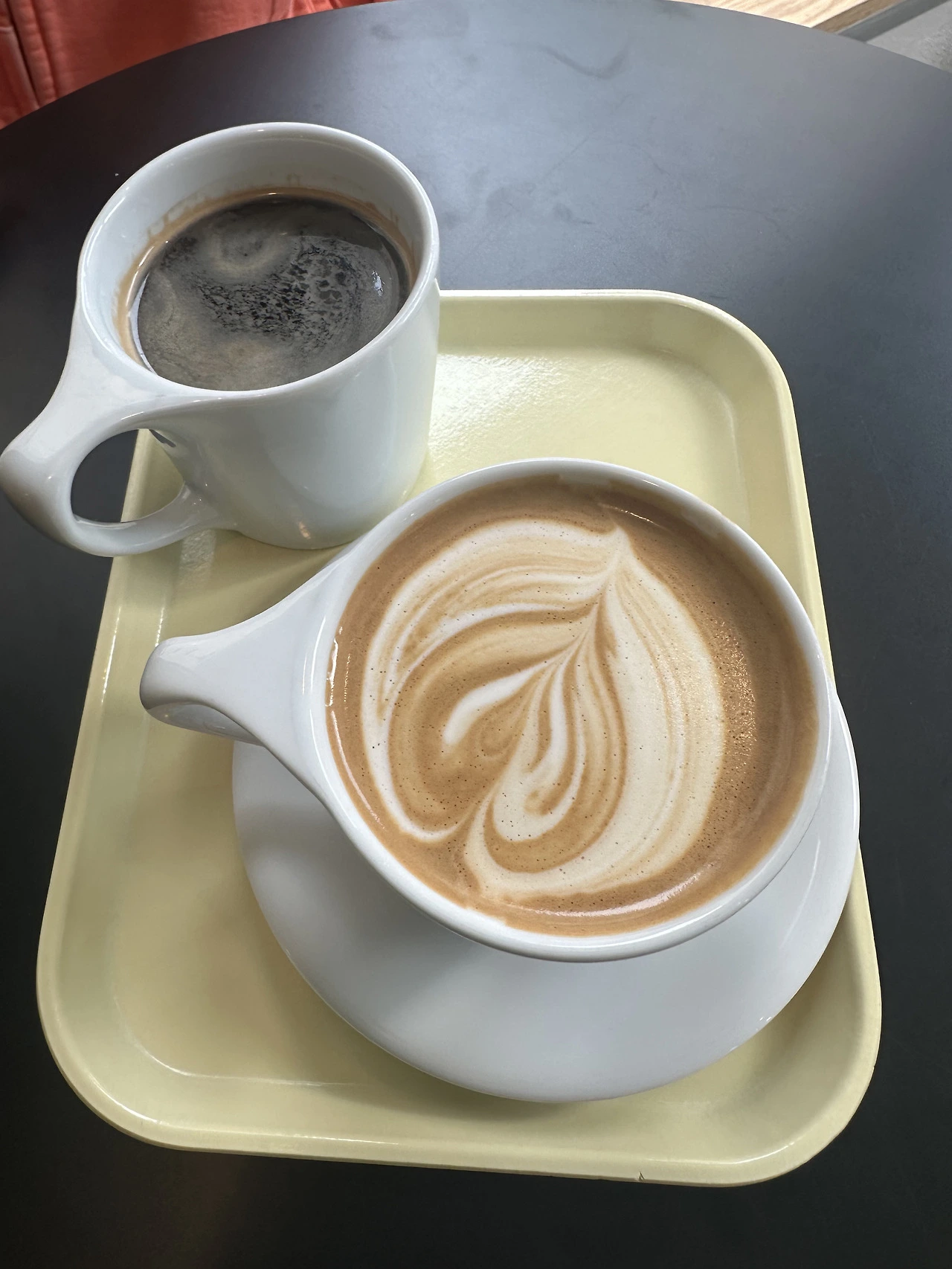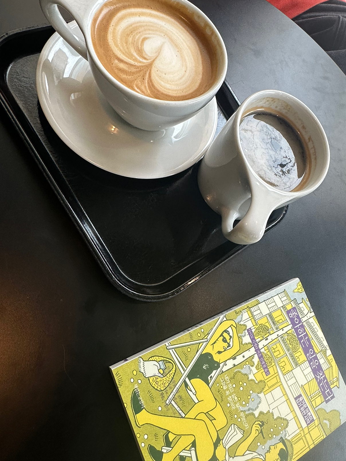 한잔으로는 모자라 두 번째 커피는 서로 반대로 시켰다. 산미 없는 아메리카노와 오트밀크 라테.