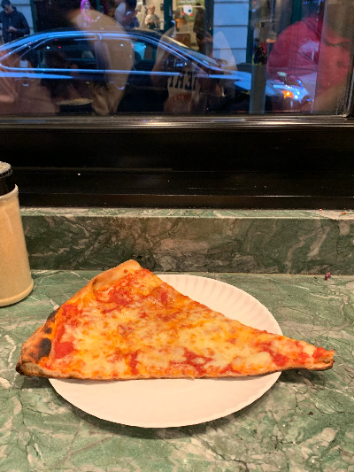 비 내리는 뉴욕의 마지막 날, 모든 일정을 마치고 숙소로 가는 길이었다. 뉴욕의 콤콤한 냄새를 뚫고 어디선가 보통의 치즈를 넘어선 맛있는 냄새가 흘러나왔다. 그저 그랬던 배가 고소한 치즈 냄새 한 번에 출출해졌다. 이건 꼭 먹어야겠다. 냄새의 출처는 골목 모퉁이에 있는 빨간 간판의 피자집이었다. 골목에서 유일하게 밝은 조스 피자(Joe’s Pizza)는 사실, 여행 전부터 지도에 따로 표기해 둔 맛집이었다. 고민 없이, 바로 들어선 식당은 아담했다. 테이블도 없이, 창가에 서서 먹어야 하는 작은 공간만 있었다. 주문하러 간 계산대 옆에는 유리 케이스 안에는 생경한 피자들이 진열되어 있었다. 계산대 앞에서 메뉴판을 보고 있는 사이, 내 뒤로 줄이 길어졌다. (신기하게도, 한산했던 가게들이 내가 들어가면 손님들로 북적거렸다. 주문이 느리다는 의미이기도 하겠지만, 나는 손님을 몰고 오는 행운의 여행객으로 긍정 해석하기로 했다.) 대기줄이 가게 밖까지 이어지자, 초조한 마음에 가장 기본적인 치즈 피자 한 조각을 주문했다. 주문이 들어가면 유리 진열대에 있는 피자를 삽으로 옮겨 화덕에서 다시 구워주는 방식이었다. 납작하고 토핑이 전혀 없는 피자 조각이 화덕으로 옮겨졌다. 예상과 다른 비주얼이었다. 이번 여행은 마지막까지 먹는 운이 따라주지 않는구나.