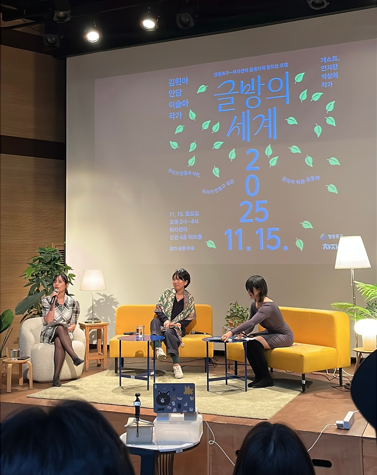 지난 15일, ‘글방의 세계’ 포럼을 다녀왔다. 글방의 시초인 어딘과 그녀 슬하의 이슬아 작가, 안담 작가가 진행을 맡았다. 200명의 청중석이 꽉 찼고, 예상시간을 한참 초과해서 막을 내렸다. 마지막 질문 시간이 길어졌기 때문이었다. 소심한 나도 질문 하나라도 던져보기 위해 부단히 손을 들었으나 채택되지 못했다. 다들 나만큼이나 질문에 진심이었다. 좀 더 민첩하게 손들지 못한 나 자신이 원망스러웠다. 사실은 질문하는 척하면서 투정을 하고 싶었다. 동료들이 글쓰기를 좋아해주지 않는다는 투정. 작가님들 눈에도 내 얼굴에서 투정의 기운을 눈치챘는지 내 눈을 한참 피했다.