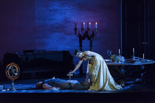후에 토스카는 스카르피아에게 자신을 허락한다는 조건으로 카바라도시의 석방을 약속받고, 그와의 저녁 식사시간에 스카르피아를 살해합니다.