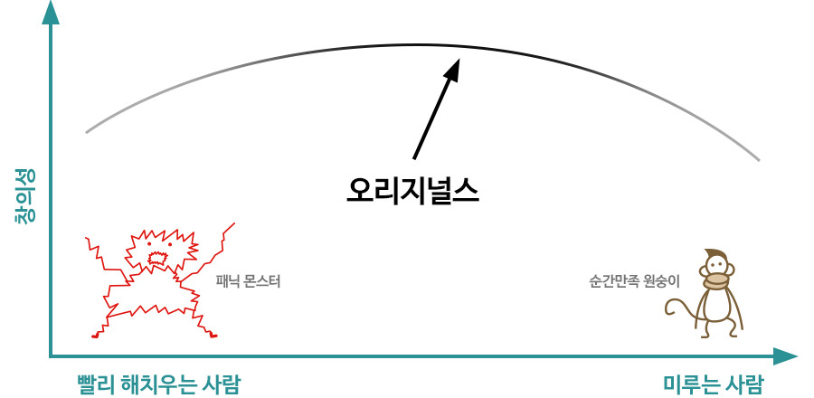 무언가를 빨리 해치우는 사람은 패닉 몬스터가 일찍 튀어나오는 사람이다. 일을 시작하는 초반부터 공포에 사로잡혀 일을 빠르게 처리해 버린다. 미루는 사람은 순간 만족 원숭이의 힘이 강하고 패닉 몬스터가 너무 늦게 나타난다. 오리지널스는 이 두 유형 사이 어딘가에 위치한다.