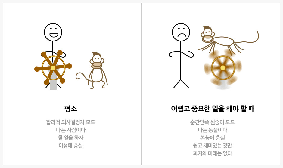 사람의 머릿속에는 '합리적 의사결정자'가 있다. 평소에는 정신의 운전대를 잘 잡고 있지만 뭔가 어렵고 중요한 일이 닥치면 '순간만족 원숭이'가 날뛰며 운전대를 뺏는다. 내가 글을 쓰기 전에 느닷없이 안 하던 청소를 하고, 이불을 개고, 조카랑 놀아주고, 책장을 정리하다가, 유튜브를 열어 뉴진스의 안무 영상을 보는 이유가 바로 이 때문이다.