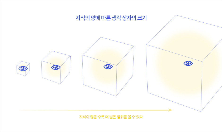 크든 작든 누구나 생각 상자를 가지고 있다. 다른 말로 '사고의 프레임'이라고 할 수 있는데, 지식과 관점으로 만들어진 이 다면체는 사람마다 크기와 모양이 다르다. 상자의 크기는 지식의 양을, 상자의 면 수는 관점의 양을 나타낸다. 지식이 많아져 상자의 크기가 커질수록 해당 관점에서 볼 수 있는 시야가 더 넓어진다. 한편 관점이 다양해질수록 대상을 더 입체적이면서 유연하게 볼 수 있다.