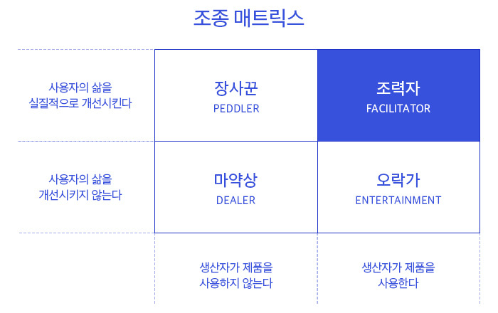 조력자(Facilitator) : 기꺼이 자신이 만든 제품을 사용하면서 동시에 사용자의 삶을 바람직하게 개선시키기를 지향함