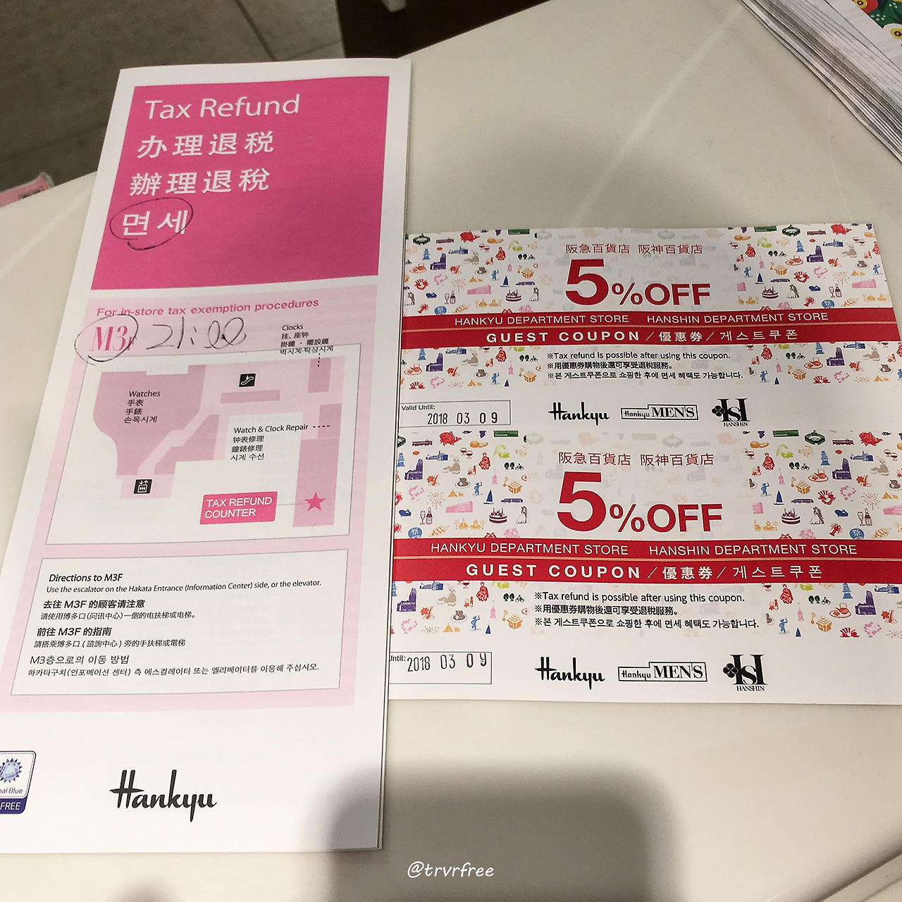 하카타역의 지하상가에는 한큐백화점 또한 위치해 있는데 1층에 위치한 인포 데스크에서 외국인 대상의 5% 할인 쿠폰을 받을 수 있으니 백화점에서 구매할 것이 있으면 한 번 들러보길 바란다.