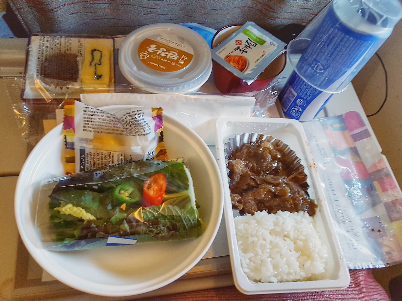 첫 번째 기내식은 불고기 쌈밥/닭가슴살 스테이크(크림소스) 두 가지가 제공되었는데, 아내와 각각 하나씩 주문하여 먹었다.