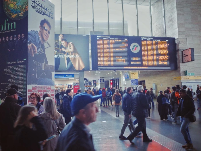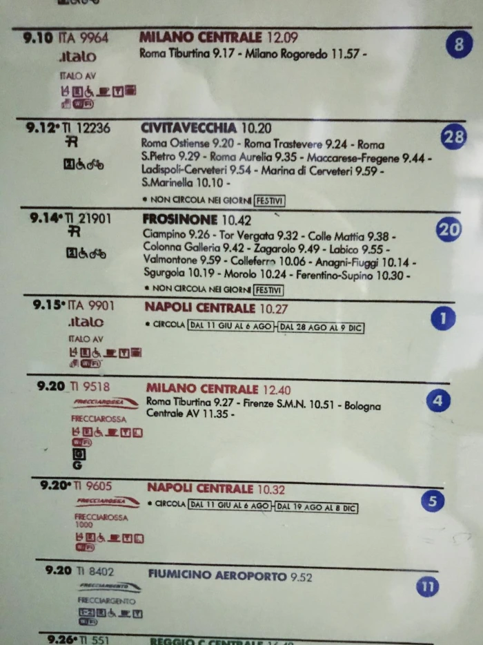 이탈리아 기차역에서 불편했던 점은 한국처럼 탑승 플랫폼이 정해진 게 아니라 출발 5분 전쯤 전광판에 표시되는 점이었다. (기차역에서 보면 다들 전광판을 쳐다보고 있다.)