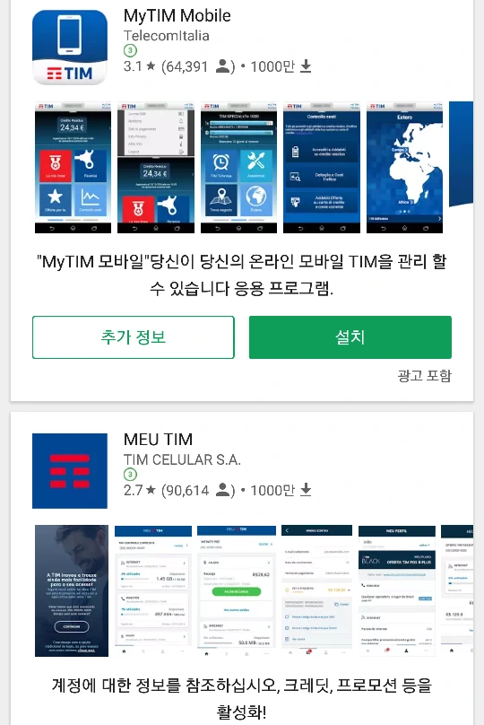 TIM이라는 명칭으로 어플을 검색했을 때 두 가지가 나와서 생겼던 해프닝으로 아래 MEU TIM이 아니라 위에 있는 MyTIM Mobile을 설치해야 한다.