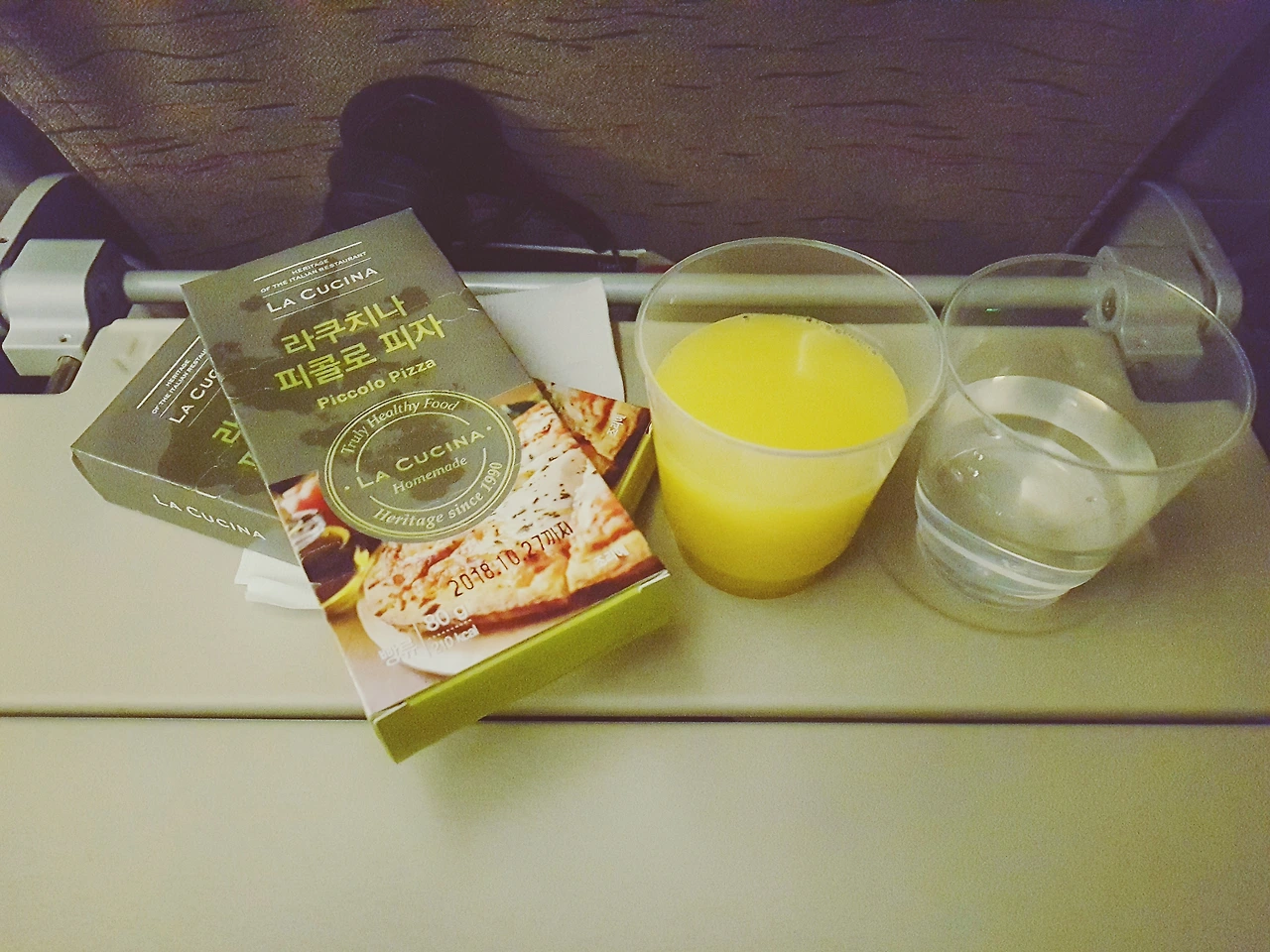 내리기 1시간 전에는 피자빵 같은 간식이 나왔는데 나는 배가 불러서, 아내는 자느라 먹지 않았다.