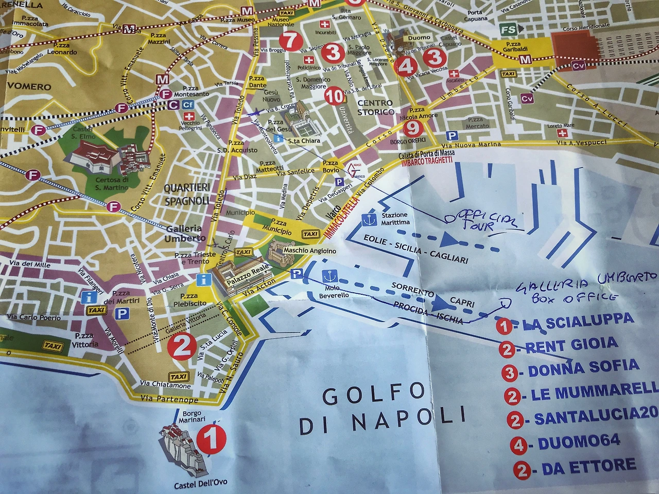 나폴리 역에서 만났던 관광안내소 직원에게 아르떼 카드를 구매할 수 있는 곳을 물어봤었는데, 관광 지도에 표시해 준 곳은 두 곳으로 우리가 갈 곳은 움베르토 1세 갤러리(사진에서 아래쪽에 써진 곳)였다.