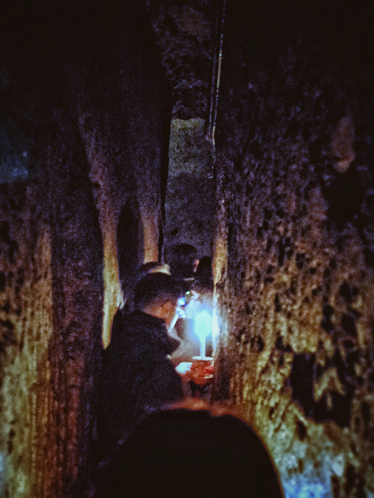 설명을 한참 듣다 이동하다 보면 하이라이트 구간이 나오는데, 당시 인부들이 지나다녔던 길을 똑같이 초를 들고 들어가는 구간이 있다. 길 폭이 좁아 폐쇄 공포증이 있는 사람은 진행하지 않을 것을 가이드는 권장한다. 실제로 좀 좁긴 하지만, 일반적인 동양인 체형이라면 큰 무리 없이 지나갈 수 있는 정도의 공간이다.