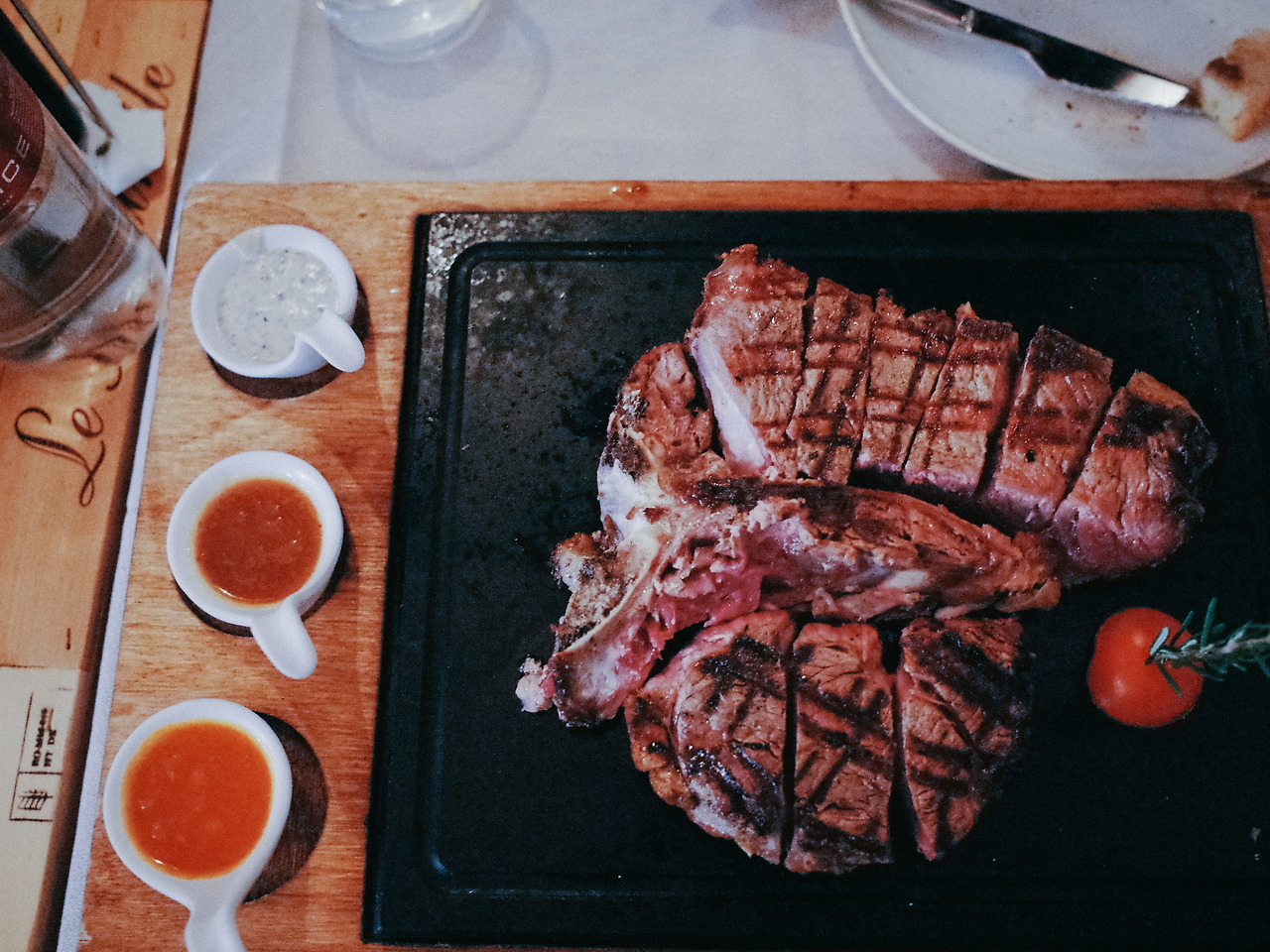 스테이크는 1.2kg라는 수에서도 느껴지듯 엄청 양이 많고 두꺼워서 평소 레어로 먹는 사람이라도 미디엄 레어를 시키는 걸 권장한다. 레어를 시키면 정말 고기점에서 볼 법한 고깃덩이가 나온다.
