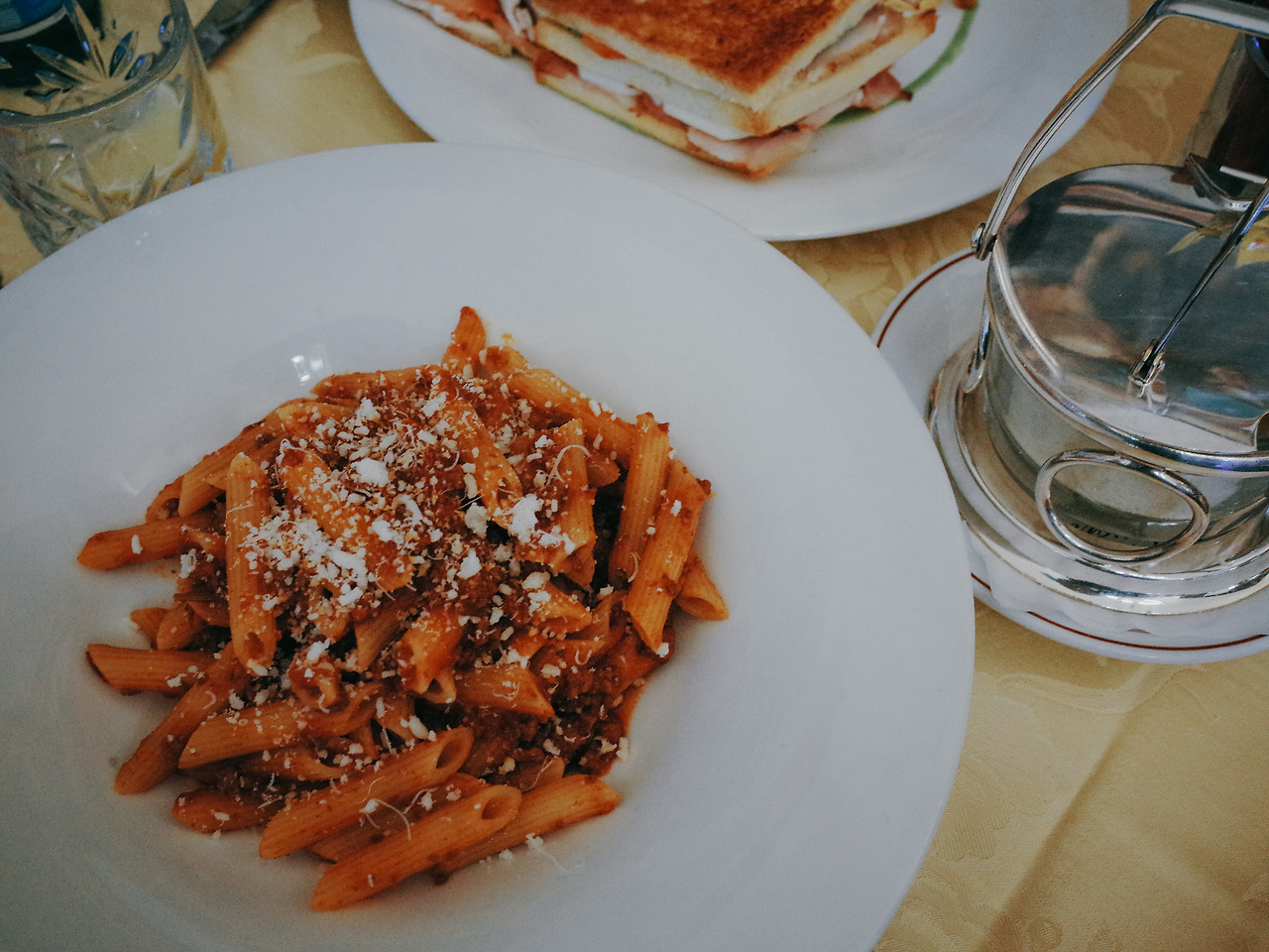 우피치 미술관 투어 집합지에 도착했을 때 1시간 정도 시간이 남아서 옆에 카페 들어가서 점심 먹었다. 고기 소스 파스타와 클럽 샌드위치 먹었는데, 고기 소스 파스타는 짭조름한 맛. 클럽 샌드위치는 빵을 엄청 바삭하게 잘 구워서 인상적이었다. 샌드위치는 담백해서 짭조름한 파스타와 함께 먹기 좋았다.