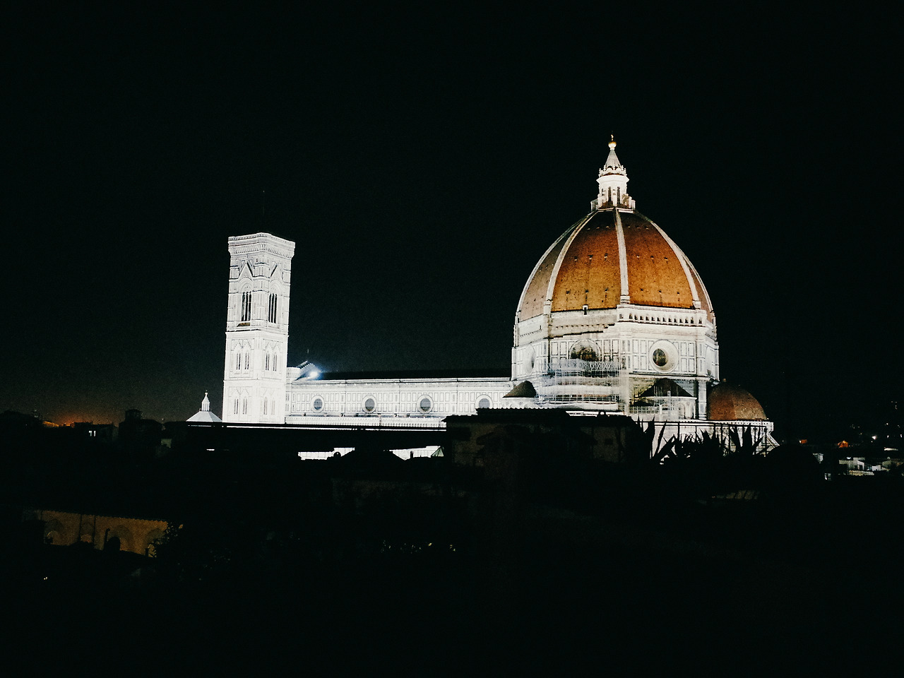 루프 탑 바에서 바라보는 두오모의 야경은 사진으로는 담을 수 없는 웅장함이 인상적이었다. 하지만 남부와 달리 피렌체의 11월 중순 저녁 날씨는 꽤 추웠고, 온열기가 있었는데도 추워서 담요를 달라고 하여 덮고 있었다. 또 적외선 온열기 때문에 카메라 화이트 밸런스가 오작동하는 건지 스마트폰 카메라로 사진을 찍으면 사진이 분홍빛으로 나오는 단점도 있었다. 개인 적으로는 완전 저녁보다는 노을이 지는 초저녁쯤이 웅장한 두오모를 배경으로 인물 사진을 찍기에 더 좋을 것 같았다.
