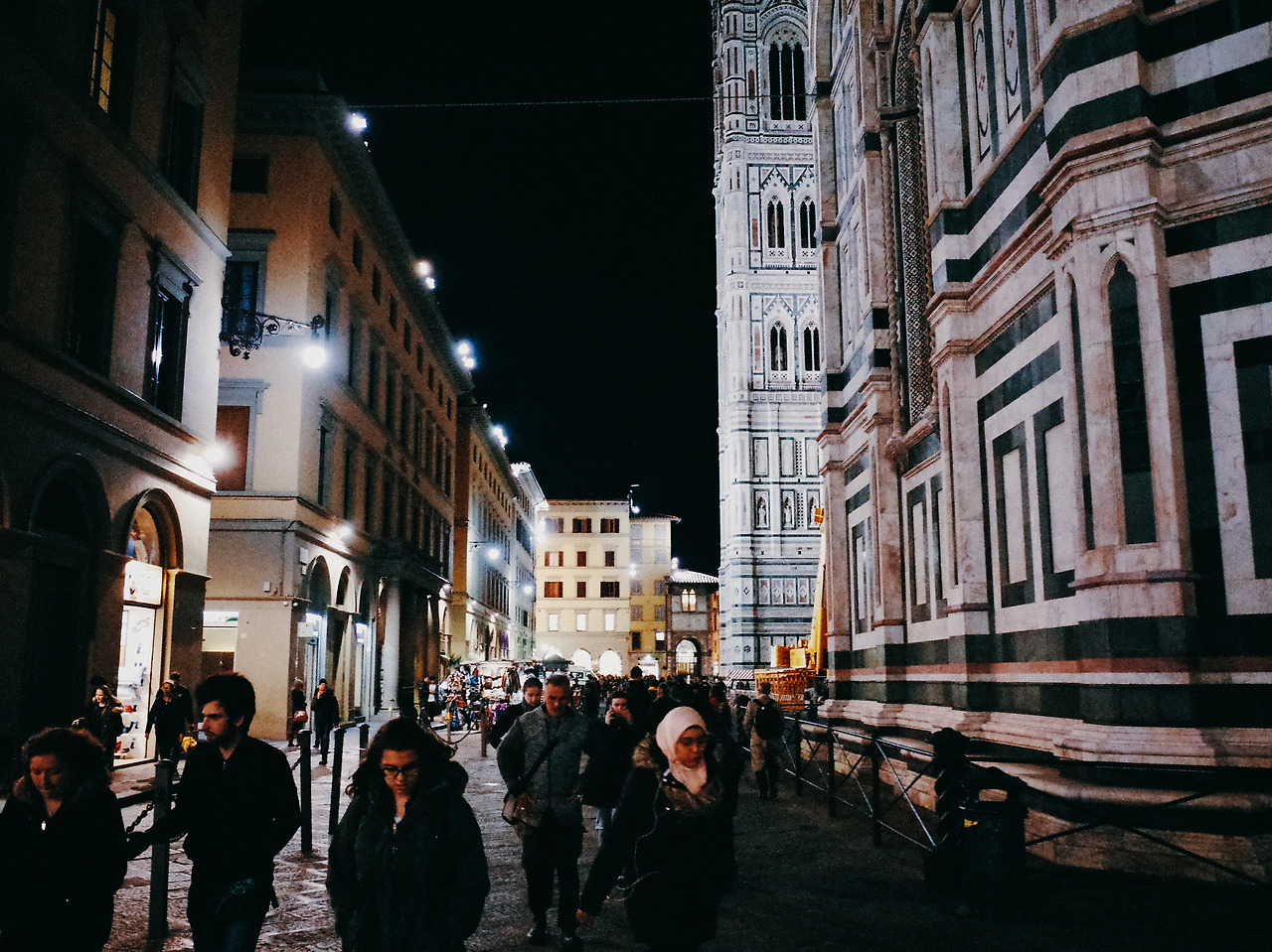 하루 종일 두오모를 오르고 미술관을 구경하며 걷느라 지친 다리를 이끌고 내일의 여정을 위해 숙소로 돌아오며 본 피렌체의 밤거리는 으슥한 골목으로만 들어가지 않는다면 여행 전 정보를 모을 때 느꼈던 것보다 위험해 보이지 않았고, 관광 중심지다 보니 사람도 많아 야경을 구경하며 돌아다니기에도 나쁘지 않아 보였다.