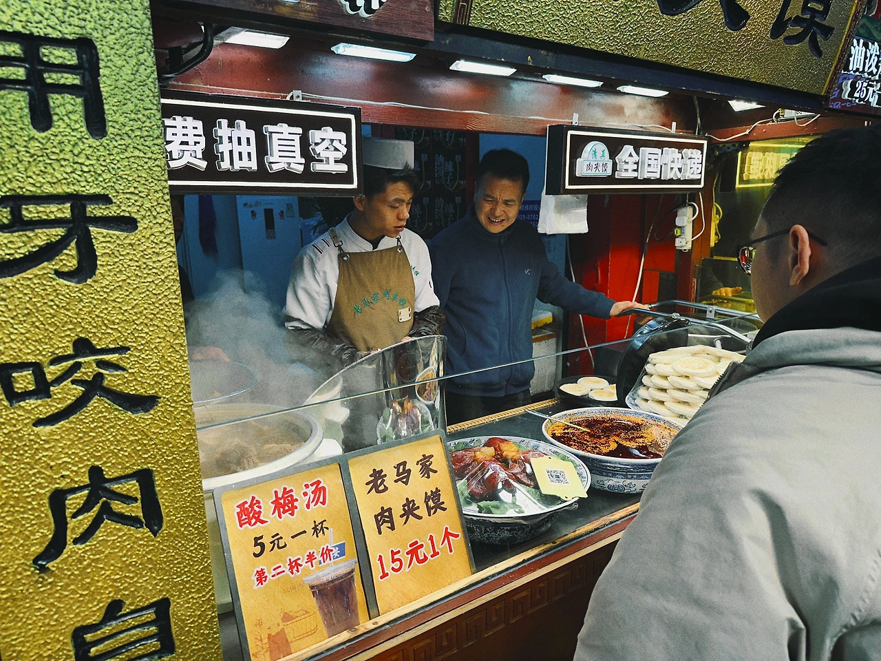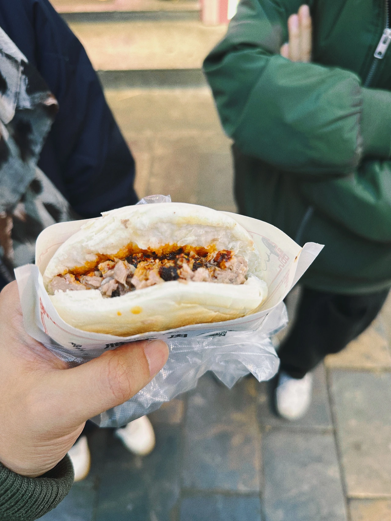걷다가 긴 줄이 선 가게를 발견해 기다렸다가 먹어본 것이 러우쟈모(肉夹馍)였다. 중국식 햄버거로 불리는 이 음식은 바삭한 빵 속에 다진 고기가 들어가는데, 어머니와 아내는 소스 향 때문에 그다진 좋았지만 개인적으로는 나쁘지 않았다. 아내와 어머니는 스즈빙(柿子饼), 일명 감호떡을 좋아했다.