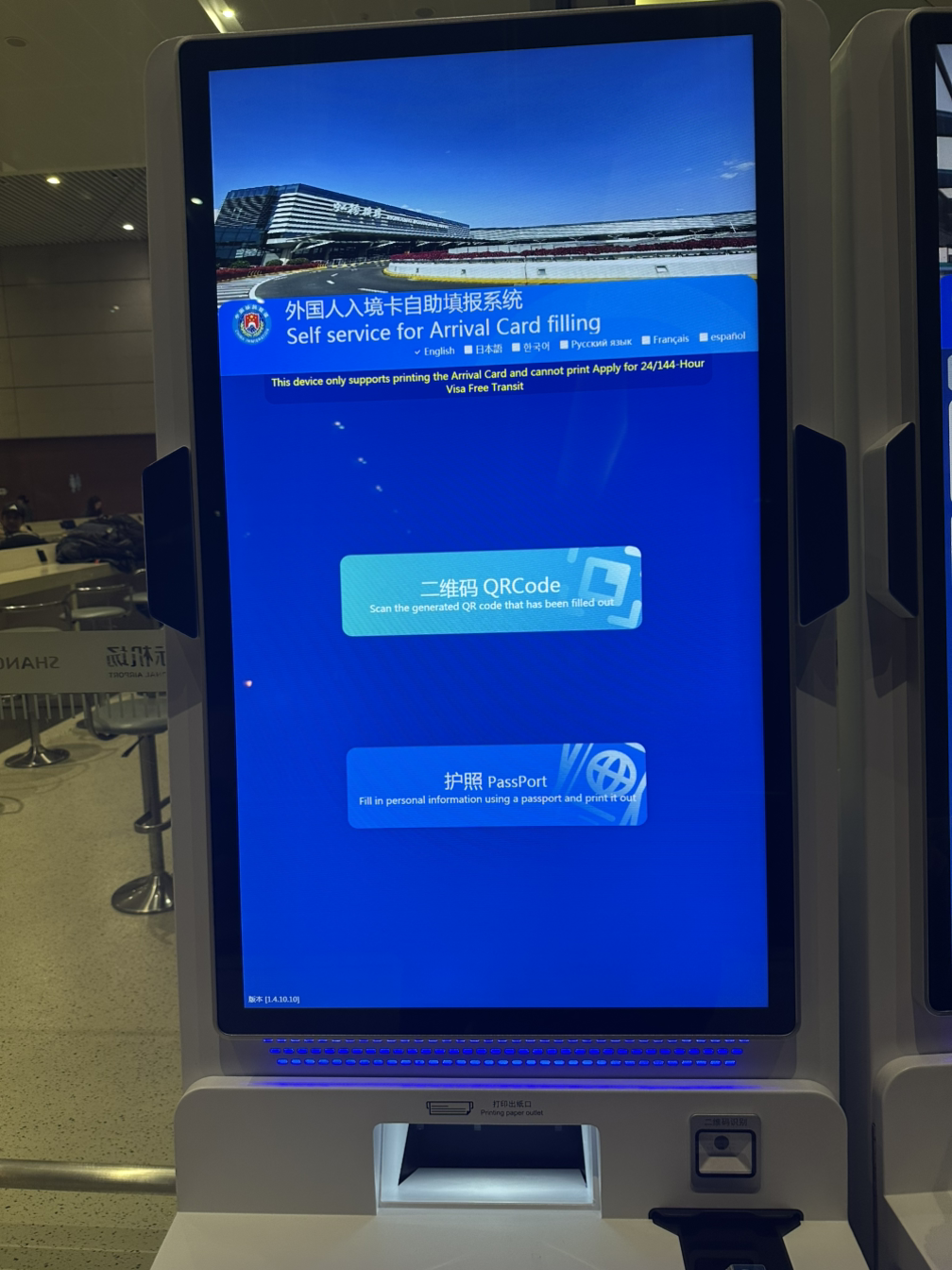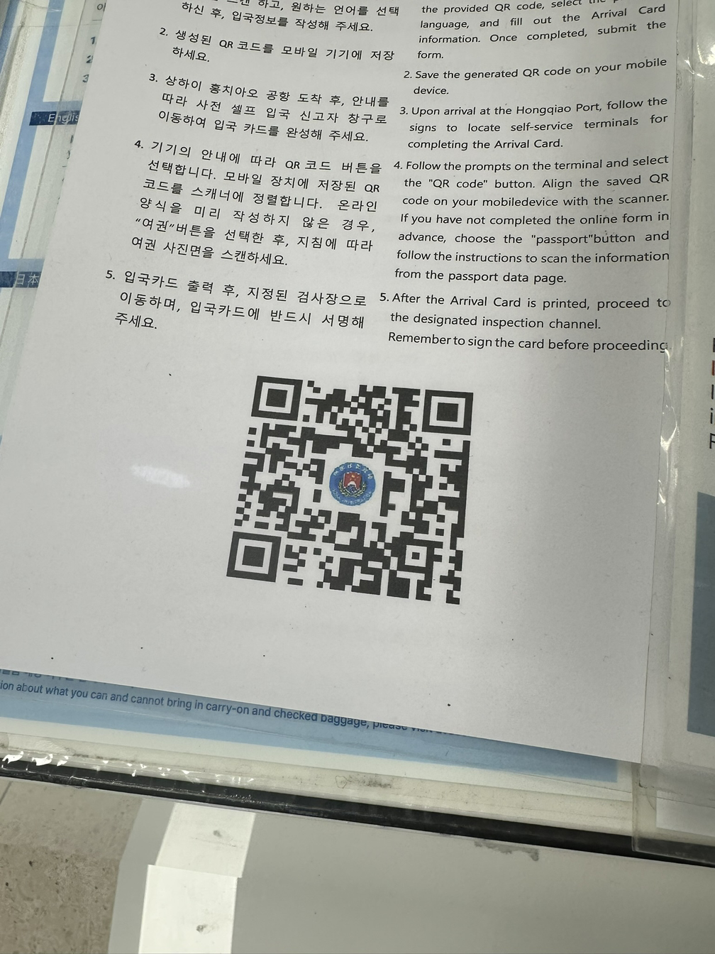 탑승 전 온라인 체크인을 해 두면 김포공항에서 짐만 붙이는 전용 창구를 이용할 수 있다. 큰 차이는 아니지만, 간단한 수속을 원하는 여행자에겐 나름의 편리함이다. 물론 김포공항 자체가 북적이는 편은 아니라 일반 수속을 밟아도 크게 불편하진 않다. 한쪽에는 중국 입국 수속카드를 모바일로 작성할 수 있는 QR코드도 준비되어 있었다. 미리 작성해두면 현지 공항에서 셀프기기로 프린트할 수 있고, 마지막엔 서명만 수기로 하면 된다.