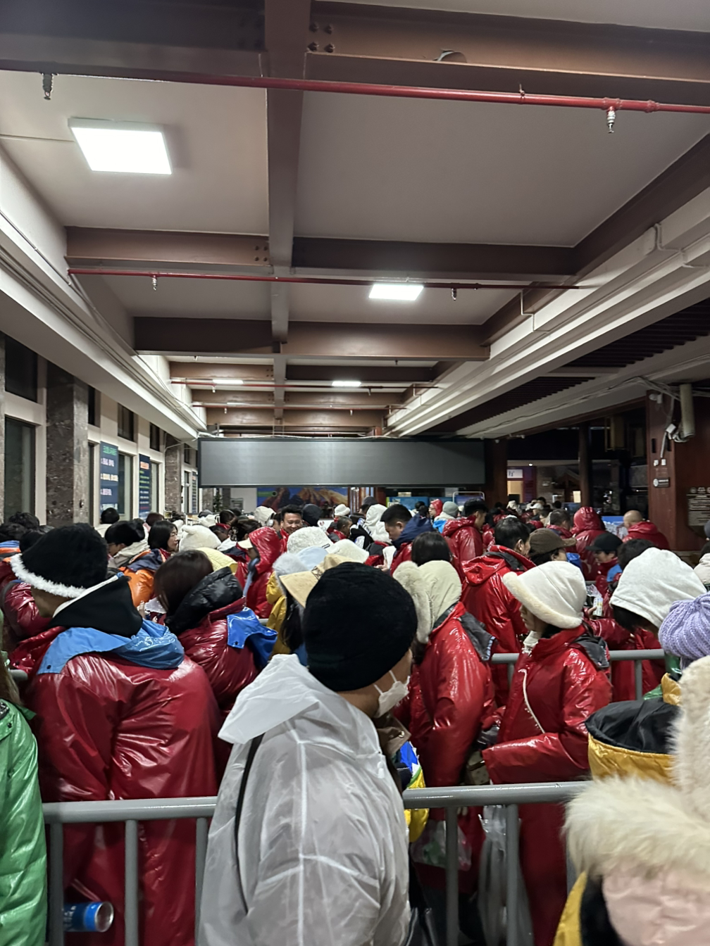 다행히 잠시 후, 운행이 재개되었고 케이블카를 기다리며 중국에 인구가 얼마나 많은지 우리는 체험하게 됐다. 형형 색색 투어사별 외투를 입은 많은 사람들을 보며 같이 간 중국인 친구는 이 정도면 사람이 없는 편이라고 했다.