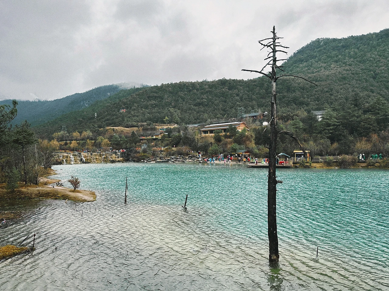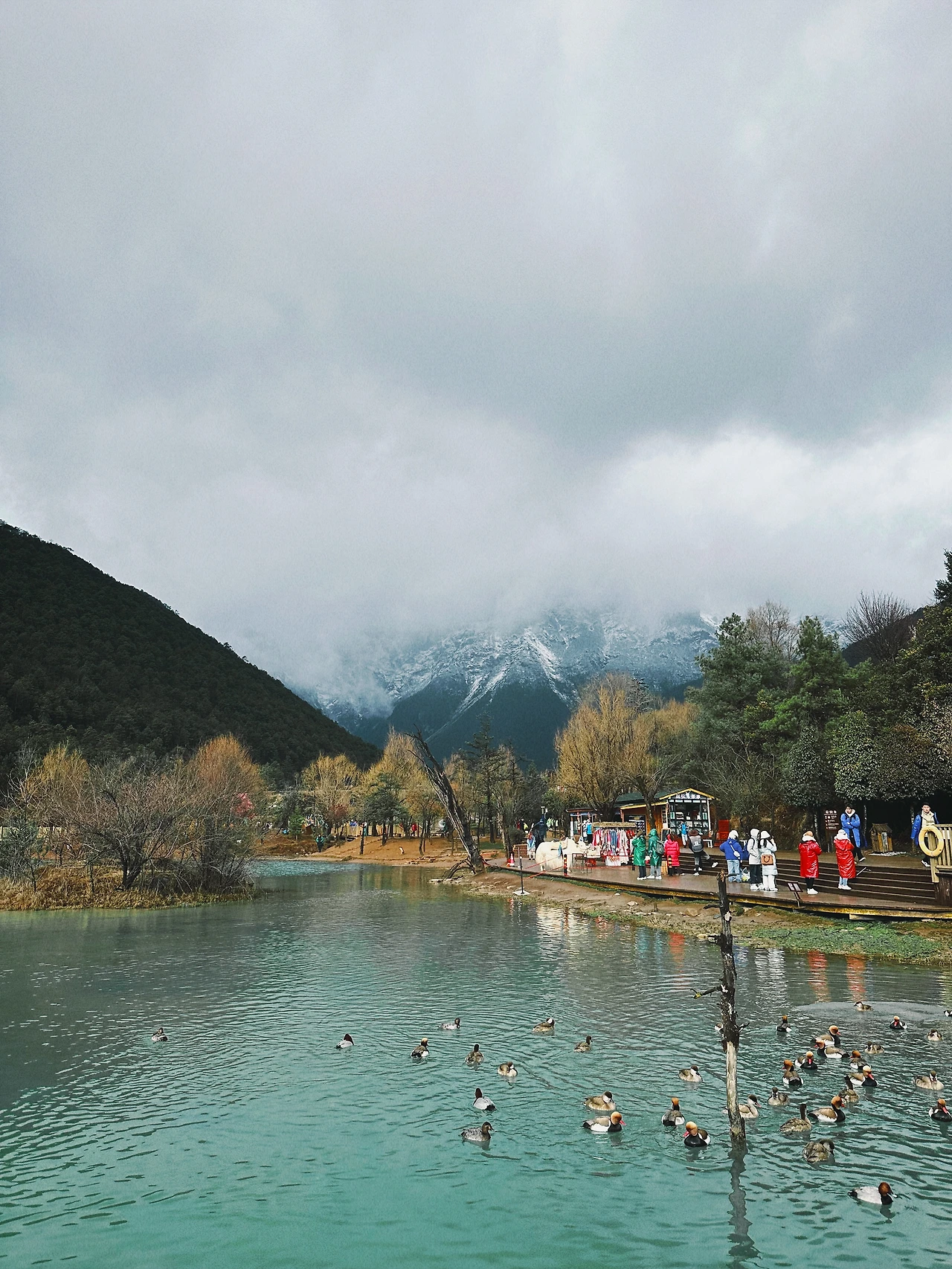 하산 후에는 람월곡(蓝月谷)으로 이동했다. 옥빛 계곡이 펼쳐진 그곳은 또 다른 세상이었다. 설산이 보여주지 못한 풍경의 빈자리를, 계곡이 조용히 채워주었다. 옥룡설산도 미안했는지 그래도 빼꼼 모습을 저 멀리서 보여주었다. 물빛은 시간에 따라 색이 변한다던데, 우리가 본 건 부드러운 옥색이었다.